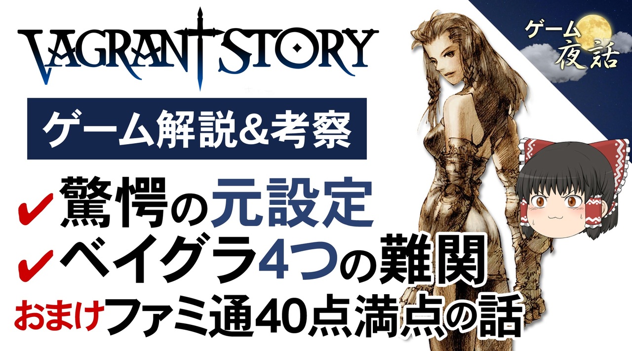 過去動画を宣伝して下さった皆さん、ありがとうございましたm(__)m<br>毎回ひとつのゲームを取り上げ、3つのテーマから解説&考察します。<br>【前編】は毎月1日・15日更新、【後編】は制作状況に応じて更新致します。<br><br><strong>第92回「ベイグラントストーリー」</strong><br>■前編:<a href="https://www.nicovideo.jp/watch/sm38210725" class="watch">sm38210725</a><br>■後編:<a href="https://www.nicovideo.jp/watch/sm38273994" class="watch">sm38273994</a><br><br>▼関連動画<br><strong>第52回「ファイナルファンタジータクティクス」</strong><br>前編:<a href="https://www.nicovideo.jp/watch/sm34976469" class="watch">sm34976469</a>(ゲームシステムの解説と考察)<br>後編:<a href="https://www.nicovideo.jp/watch/sm35019889" class="watch">sm35019889</a>(ストーリーの考察 正しさとは何か?)<br><br><strong>第3回「タクティクスオウガ」</strong><br>前編:<a href="https://www.nicovideo.jp/watch/sm29953630" class="watch">sm29953630</a>(ゲームシステムの解説と考察)<br>後編:<a href="https://www.nicovideo.jp/watch/sm29980526" class="watch">sm29980526</a>(ストーリーの考察 姉の選択肢、父親の遺言など)<br><br>■youtubeはこちら <a href="https://youtu.be/ppmEvm8aXEo" target="_blank" rel="noopener nofollow">https://youtu.be/ppmEvm8aXEo</a><br>■告知用のツイッター <a href="https://twitter.com/gameyawa" target="_blank" rel="noopener nofollow">https://twitter.com/gameyawa</a><br><br>■第92回「メタルギアソリッド3 スネークイーター」<br>前編:<a href="https://www.nicovideo.jp/watch/sm38123991" class="watch">sm38123991</a> 中編:<a href="https://www.nicovideo.jp/watch/sm38148842" class="watch">sm38148842</a> 後編:<a href="https://www.nicovideo.jp/watch/sm38169344" class="watch">sm38169344</a><br>■第93回「十三機兵防衛圏」<br>前編:<a href="https://www.nicovideo.jp/watch/sm38284861" class="watch">sm38284861</a> 後編:※ただいま作成中ですm(__)m<br><br>■ゲーム夜話マイリスト <a href="https://www.nicovideo.jp/mylist/56973971" target="_blank" rel="noopener">mylist/56973971</a><br><span style="color: #000000; font-size: 13px;">■ゲーム夜話特別編マイリスト <a href="https://www.nicovideo.jp/mylist/65104419" target="_blank" rel="noopener">mylist/65104419</a><br><br>■ゲームジャンル別マイリスト</span><br>・RPG <a href="https://www.nicovideo.jp/mylist/69852172" target="_blank" rel="noopener">mylist/69852172</a><br>・アクション <a href="https://www.nicovideo.jp/mylist/69852179" target="_blank" rel="noopener">mylist/69852179</a><br>・アクションRPG <a href="https://www.nicovideo.jp/mylist/69852177" target="_blank" rel="noopener">mylist/69852177</a><br>・アドベンチャー <a href="https://www.nicovideo.jp/mylist/69852182" target="_blank" rel="noopener">mylist/69852182</a><br>・アクションアドベンチャー <a href="https://www.nicovideo.jp/mylist/69852188" target="_blank" rel="noopener">mylist/69852188</a><br>・シミュレーション <a href="https://www.nicovideo.jp/mylist/69852189" target="_blank" rel="noopener">mylist/69852189</a><br>・ホラー <a href="https://www.nicovideo.jp/mylist/69852194" target="_blank" rel="noopener">mylist/69852194</a><br>・サウンドノベル <a href="https://www.nicovideo.jp/mylist/69852197" target="_blank" rel="noopener">mylist/69852197</a>