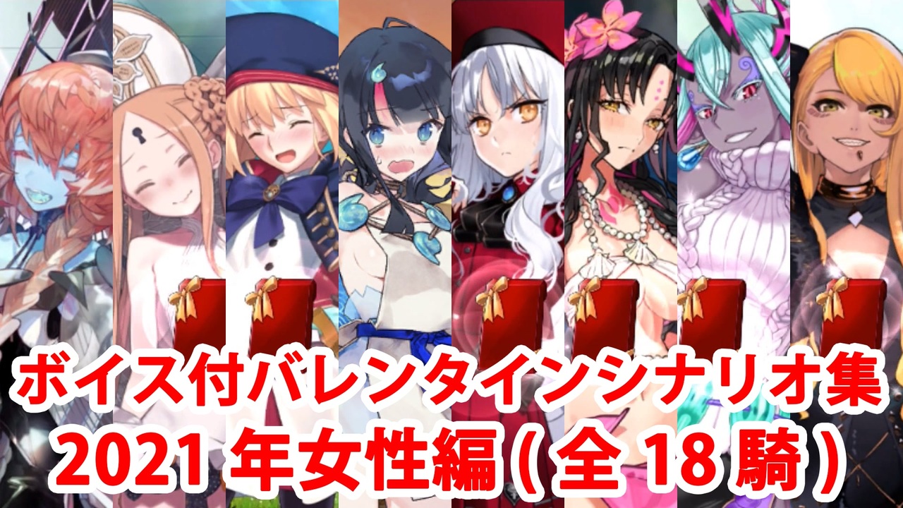 期間限定イベント「愛の伝道師アムールちゃんのサン・バレンティーノ! ~カルデア・ビター・バレンタイン2021~」のボイス付ミニシナリオまとめです。<br>対象は2020年2月以降に追加された全女性サーヴァントです。<br>性別・選択肢差分を収録しています。<br>順番は以下です。(投稿者コメントも参照)<br><br><a href="#" class="seekTime" data-seekTime="00:05" onclick="seekNicoPlayer('#00:05'); return false;">#00:05</a> ディオスクロイ・カストロ&ポルクス(CV:内田雄馬&内田真礼) 「ジェミニ・スイート」<br><a href="#" class="seekTime" data-seekTime="05:45" onclick="seekNicoPlayer('#05:45'); return false;">#05:45</a> 鬼女紅葉(CV:日笠陽子) 「じゅらしっくちょこじゃ」<br><a href="#" class="seekTime" data-seekTime="11:50" onclick="seekNicoPlayer('#11:50'); return false;">#11:50</a> 宇津見エリセ(CV:鬼頭明里) 「ふつうの友チョコ」<br><a href="#" class="seekTime" data-seekTime="19:44" onclick="seekNicoPlayer('#19:44'); return false;">#19:44</a> アルトリア・キャスター(CV:川澄綾子) 「ファースト・バレンタイン」<br><a href="#" class="seekTime" data-seekTime="28:39" onclick="seekNicoPlayer('#28:39'); return false;">#28:39</a> 殺生院キアラ〔ムーンキャンサー〕(水着)(CV:田中理恵) 「一夏の蜃気楼セット」<br><a href="#" class="seekTime" data-seekTime="43:19" onclick="seekNicoPlayer('#43:19'); return false;">#43:19</a> イリヤスフィール・フォン・アインツベルン〔アーチャー〕(水着)(CV:門脇舞以) 「スプレッド☆レインボー!」<br><a href="#" class="seekTime" data-seekTime="54:34" onclick="seekNicoPlayer('#54:34'); return false;">#54:34</a> ブリュンヒルデ〔バーサーカー〕(水着)(CV:能登麻美子) 「ヴァルキリー・ウェディング」<br><a href="#" class="seekTime" data-seekTime="60:44" onclick="seekNicoPlayer('#60:44'); return false;">#60:44</a> 虞美人〔ランサー〕(水着)(CV:伊瀬茉莉也) 「幸せを報告する義理チョコ」<br><a href="#" class="seekTime" data-seekTime="67:24" onclick="seekNicoPlayer('#67:24'); return false;">#67:24</a> アビゲイル・ウィリアムズ〔夏〕(水着)(CV:大和田仁美) 「スターリィ・ナイト」<br><a href="#" class="seekTime" data-seekTime="75:36" onclick="seekNicoPlayer('#75:36'); return false;">#75:36</a> 巴御前〔セイバー〕(水着)(CV:金元寿子) 「滋養印ゼリー」<br><a href="#" class="seekTime" data-seekTime="82:01" onclick="seekNicoPlayer('#82:01'); return false;">#82:01</a> 紫式部〔ライダー〕(水着)(CV:茅野愛衣) 「ライブラリ・アイスクリーム」<br><a href="#" class="seekTime" data-seekTime="90:30" onclick="seekNicoPlayer('#90:30'); return false;">#90:30</a> 卑弥呼(CV:田村ゆかり) 「光のヒミチョコ」<br><a href="#" class="seekTime" data-seekTime="101:03" onclick="seekNicoPlayer('#101:03'); return false;">#101:03</a> クリュティエ・ヴァン・ゴッホ(CV:高橋花林) 「ゴッホのチョコマリナード(未遂)」<br><a href="#" class="seekTime" data-seekTime="105:50" onclick="seekNicoPlayer('#105:50'); return false;">#105:50</a> 伊吹童子(CV:悠木碧) 「デビルズフードケーキ」<br><a href="#" class="seekTime" data-seekTime="112:38" onclick="seekNicoPlayer('#112:38'); return false;">#112:38</a> ヴリトラ(CV:朝日奈丸佳) 「封じられた最上の美味」<br><a href="#" class="seekTime" data-seekTime="119:12" onclick="seekNicoPlayer('#119:12'); return false;">#119:12</a> 平景清(CV:早見沙織) 「源平せんべい」<br><a href="#" class="seekTime" data-seekTime="125:06" onclick="seekNicoPlayer('#125:06'); return false;">#125:06</a> 鬼一法眼(CV:加隈亜衣) 「開けてびっくり天狗チョコ」<br><a href="#" class="seekTime" data-seekTime="131:29" onclick="seekNicoPlayer('#131:29'); return false;">#131:29</a> アムール〔カレン〕(カレン・C・オルテンシア)(CV:小清水亜美) 「ヘブンリー・ハート」<br><br>男性は<a href="https://www.nicovideo.jp/watch/sm38269303" class="watch">sm38269303</a><br><br>YouTube版はこちら (高画質)<br><a href="https://www.youtube.com/watch?v=HpRm-pAISW8" target="_blank" rel="noopener nofollow">https://www.youtube.com/watch?v=HpRm-pAISW8</a><br><br><a target="_blank" href="https://qa.nicovideo.jp/faq/show/19424?site_domain=default" style="font-size: 13px;color: #657586; text-decoration: underline; line-height: 1.4">この動画は投稿者によって修正されました</a>