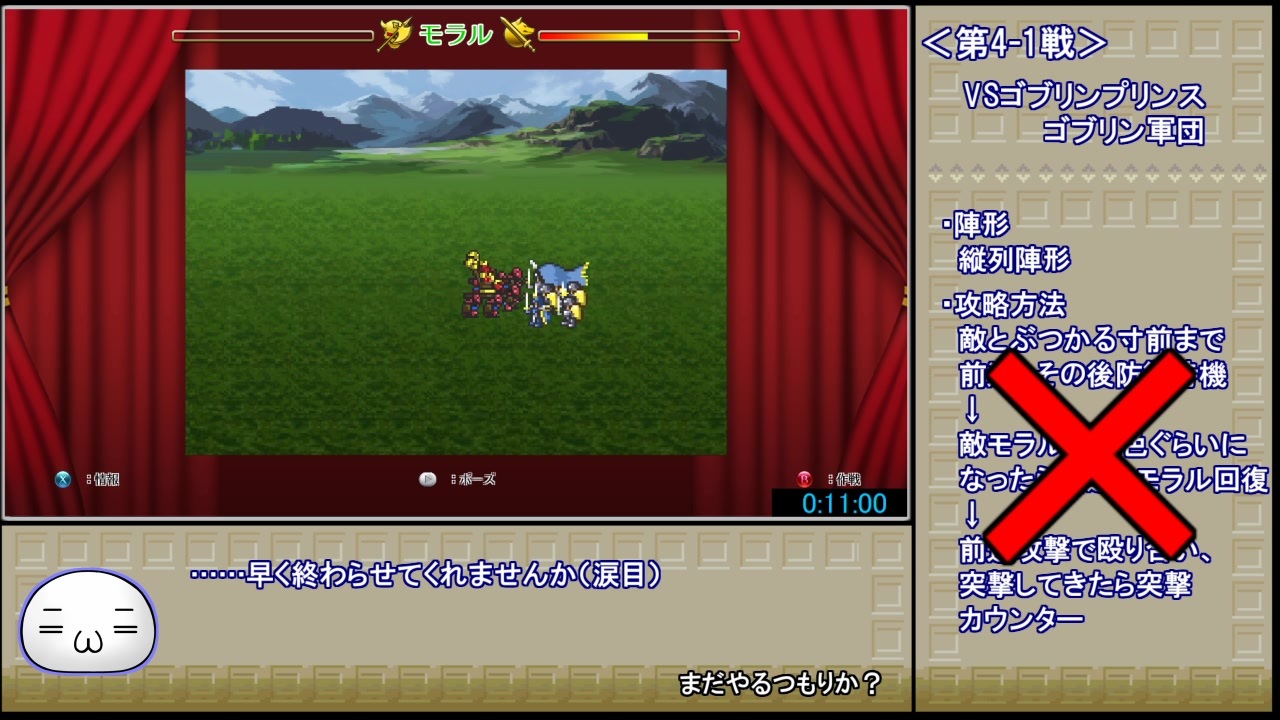 (RTAは)初投稿です。<br><br>この動画は「ロマンシングサガ3」(リマスター版)のゆっくり実況動画です。<br><span style="color: #ff0000;"><strong>初期作戦のみを使って</strong></span>マスコンバットのタイムアタックを行います。<br><br><タイム計測区間><br>「NEW GAME」選択時から最終戦闘で「勝利!!」が表示されるまで<br><br><対戦相手><br>ロアーヌから出ないで戦うことができる連中<br><strong>前編(これ):ゴブリン軍団、ゴドウィン、パッペンハイム、演習、エドウィン、野盗</strong><br>後編:沼、城、防衛、坂、砂漠<br><br><プレイ環境><br>PC(Steam版)<br>PS2コントローラ(ELECOM製USBアダプタでPCに接続)<br><br><ルールなど><br><span style="color: #ff0000;"><strong>・初期作戦以外は使用不可</strong></span><br>・傭兵なし<br>・演習の連戦は全て勝利する<br><br><先駆者様><br>マスコン初期縛り:<a href="https://www.nicovideo.jp/watch/sm710634" class="watch">sm710634</a><br>ダリルの墓兄貴:<a href="https://www.nicovideo.jp/watch/sm37148323" class="watch">sm37148323</a><br>生肉定食兄貴:<a href="https://www.nicovideo.jp/watch/sm37434713" class="watch">sm37434713</a><br><br><br>とりあえず何か動画を作ろうと考えてできた企画なのでいろいろガバガバです。<br>遠慮なく無慈悲してください。<br><br>後編→<a href="https://www.nicovideo.jp/watch/sm38393371" class="watch">sm38393371</a><br><br>RTAマイリスト <a href="https://www.nicovideo.jp/mylist/70535886" target="_blank" rel="noopener">mylist/70535886</a><br>他のゆっくり実況もどうぞ <a href="https://www.nicovideo.jp/mylist/38783443" target="_blank" rel="noopener">mylist/38783443</a><br><br>※広告ありがとうございます!!<br><br>© 1995, 2019 SQUARE ENIX CO., LTD. All Rights Reserved. <br>Planned & Developed by ArtePiazza <br>ILLUSTRATION: TOMOMI KOBAYASHI 当該作品の転載・配布は禁止いたします。<br><br>