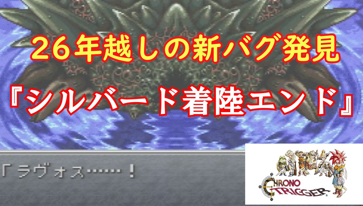 先日、クロノトリガーを2画面プレイしていたところ<br>シルバード突入ルートで新種のバグが発生した為、<br>発生条件など検証し、一部動画にまとめました。<br><br>その他にもボロボロバグが発生しているので、<br>細々したものは今後順次まとめていきます。<br><br>■バグ発生時の生放送<br><a href="https://youtu.be/GHmQPBJuPeE" target="_blank" rel="noopener nofollow">https://youtu.be/GHmQPBJuPeE</a><br><br>■バグの発生条件<br>①「黒の夢」経由でラヴォスの外殻を破壊しておくこと<br>②時の最果て(バケツ)、シルバード経由での<br> ラヴォス登場シーンを見ないでおくこと<br> (1度見てしまうと、以降ラヴォス登場イベントが省略されてしまう為)<br>③シルバード突入イベント中の”ある場面で”少し待つ!<br><br>非常にお手軽なバグなので、試してみてください。<br><br>
