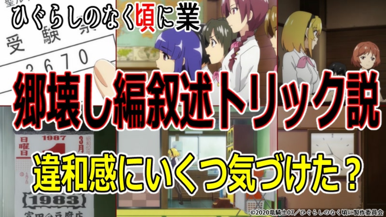今更ですが、『視点複合説』と言ったほうが正しいのかもしれませんね。<br>コメント内容は自由ですが、<br>最初は非表示推奨です。<br><br>19話感想でコメントいただいた青龙圣者さんの『沙都子は1回目に受験に失敗し、2回目に合格した説』を参考にさせていただきました!合格発表時の動線についてもご助言いただきました!ありがとうございます!<br><br>【ツイッター】告知や面白いものの共有用<br><a href="https://twitter.com/toori0303" target="_blank" rel="noopener nofollow">https://twitter.com/toori0303</a><br>【pixiv】動画用に描いた絵や漫画のまとめ等<br><a href="https://www.pixiv.net/users/9142671" target="_blank" rel="noopener nofollow">https://www.pixiv.net/users/9142671</a><br>【欲しい物リスト】送って頂いた原作書籍はアニメに絡めて動画を出せたらと思っています。<br><a href="https://www.amazon.jp/hz/wishlist/ls/2KZ6H6K2WSG4Z?ref_=wl_share" target="_blank" rel="noopener nofollow">https://www.amazon.jp/hz/wishlist/ls/2KZ6H6K2WSG4Z?ref_=wl_share</a><br>【質問箱】匿名で質問したいという方へ<br><a href="https://marshmallow-qa.com/toori0303" target="_blank" rel="noopener nofollow">https://marshmallow-qa.com/toori0303</a><br>【ブログ】アニメを見て動画作成用に使った情報をまとめています<br><a href="http://tooltoyama.livedoor.blog/" target="_blank" rel="noopener nofollow">http://tooltoyama.livedoor.blog/</a><br><br><br>公式HP<br><a href="https://higurashianime.com/" target="_blank" rel="noopener nofollow">https://higurashianime.com/</a><br>