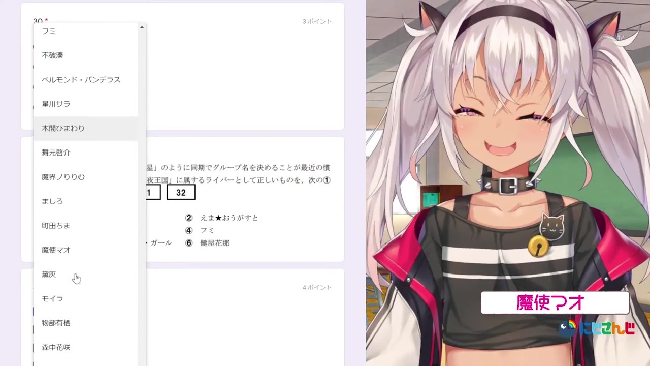 最後の問題でオシを答えるで天宮こころ、夜見れな、フレン、夕陽リリ、黛灰・・・決められない。<br>本編<br><a href="https://www.youtube.com/watch?v=RHhlfFuIgp0&t=1139s" target="_blank" rel="noopener nofollow">https://www.youtube.com/watch?v=RHhlfFuIgp0&t=1139s</a><br>SUPER DRINK BROS.<br>魔使マオ<br><a href="https://www.youtube.com/channel/UCerkculBD7YLc_vOGrF7tKg" target="_blank" rel="noopener nofollow">https://www.youtube.com/channel/UCerkculBD7YLc_vOGrF7tKg</a><br>やべえよ・・・<br>【問題】<br><a href="https://docs.google.com/forms/d/e/1FA..." target="_blank" rel="noopener nofollow">https://docs.google.com/forms/d/e/1FA...</a><br>【問題を作ったすごい方】<br>ヤマたさん<br>配信タグ #まおんらいぶ<br>【マオのとてもおもしろいTwitter】<br><a href="https://twitter.com/matsukai_mao" target="_blank" rel="noopener nofollow">https://twitter.com/matsukai_mao</a>