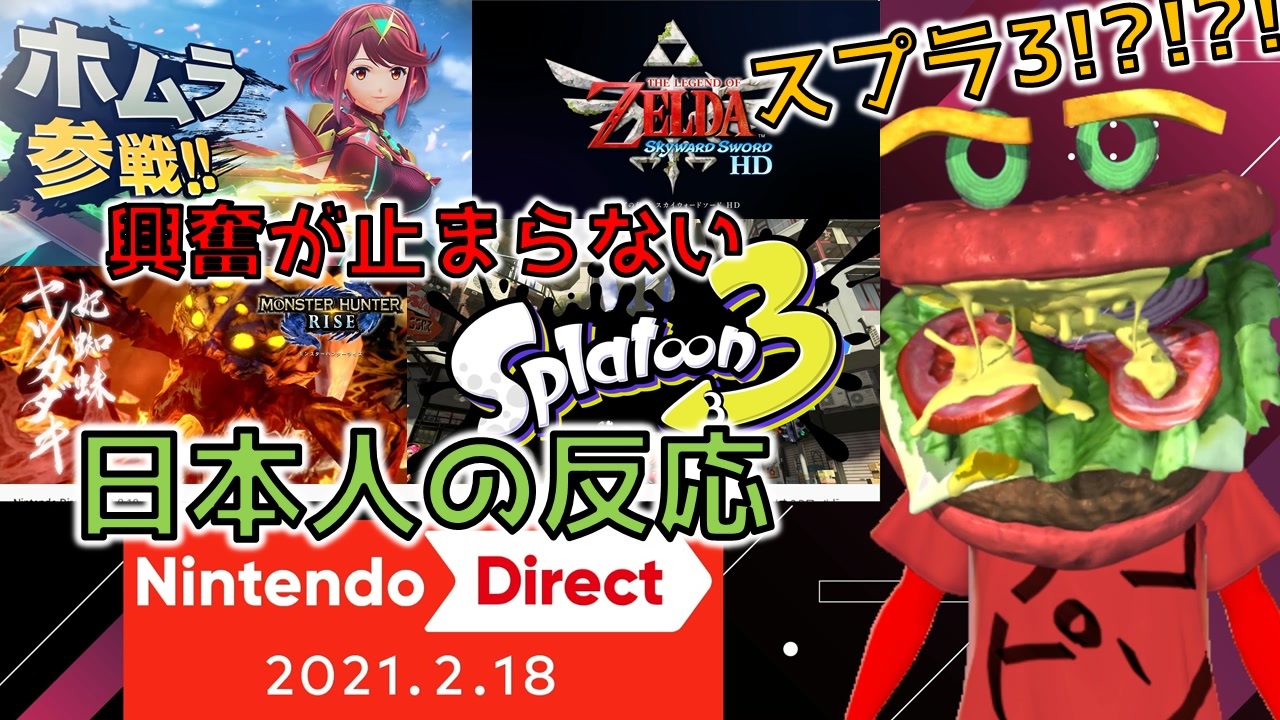 桜井さんと野上さんに見事に弄ばれました<br><br><span style="color: #38761d; font-size: 16px;"><strong>概要</strong></span><br><span style="font-size: 13px;"><strong>騒がしいハンバーガーが「</strong></span><strong>Nintendo Direct 2021.2.18</strong><span style="font-size: 13px;"><strong>」を初見で見た反応動画の切り抜き</strong></span><br><strong>スマブラSPホムラ/ヒカリ参戦</strong>、<strong>モンハンライズPV4</strong>、マリオゴルフ新作、FallGuys Switch版、<strong>スカウォHD</strong>、<strong>Splatoon3</strong>に対する反応が収録されてます。<br><br>見ている映像はこちら<br><a href="https://www.youtube.com/watch?v=vlV1kMnMuJU" target="_blank" rel="noopener nofollow">https://www.youtube.com/watch?v=vlV1kMnMuJU</a><br><br><span style="color: #ff0000; font-size: 16px;"><strong>動画リンク</strong></span><br><strong>他発表タイトルも含めたダイレクト全編の反応→</strong><a href="https://www.nicovideo.jp/watch/sm38294444" class="watch">sm38294444</a><br><br><strong>星野源『創造』MV初見の反応→</strong><a href="https://www.nicovideo.jp/watch/sm38287523" class="watch">sm38287523</a><br><br><strong>ニンダイ2021.2.17の反応→<br><br>ニンダイやPVなどの実況反応マイリスト:<a href="https://www.nicovideo.jp/mylist/53787377" target="_blank" rel="noopener">mylist/53787377</a></strong><br><span style="font-size: 13px;">スマブラの反応まとめ:<a href="https://www.nicovideo.jp/mylist/63367998" target="_blank" rel="noopener">mylist/63367998</a></span><br><br /><span style="color: #cc0000; font-size: 16px;"><strong>Youtubeチャンネル</strong></span><br><strong><a href="https://www.youtube.com/@Tomeitou" target="_blank" rel="noopener nofollow">https://www.youtube.com/@Tomeitou</a></strong><br><br><span style="color: #9900ff; font-size: 18px;"><strong>Twitch</strong></span><br><a href="https://www.twitch.tv/tomeitou_meitou" target="_blank" rel="noopener nofollow">https://www.twitch.tv/tomeitou_meitou</a><br><br><span style="font-size: 18px;"><strong>X</strong></span><br><a href="https://twitter.com/tomeitou_meitou" target="_blank" rel="noopener nofollow">https://twitter.com/tomeitou_meitou</a><br>