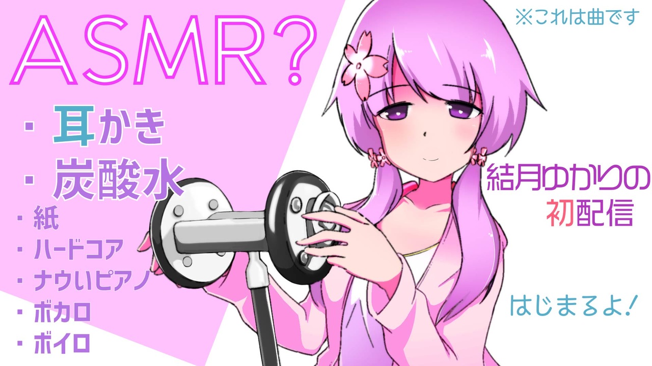 ボカロでボイロなゆかりさんがVTuberになって初配信で耳かきやら囁きボイスやら披露する疑似バイノーラルASMRな曲です。フィクションです。<br><br><span style="color: #9900ff;"><u>子牛さん主催の企画「ネタ曲投稿祭」参加作品です。</u></span><br><br>【投稿祭マイリスト】<br><a href="https://www.nicovideo.jp/mylist/70420831" target="_blank" rel="noopener nofollow">https://www.nicovideo.jp/mylist/70420831</a><br><br>【結果報告】<br>ネタ曲投稿祭13位!たくさんのご視聴、コメント、マイリス、ありがとうございました!<br><br>…あ〜お客様、マイリスといいねはどうかそのままで…!頼む、頼むです…!<br><br><br><br>曲・動画・耳かき・炭酸水の音・紙を丸める音:モエソデ<br>絵:オイヤマ<br>歌:VOCALOID 結月ゆかり 穏<br>囁:結月ゆかり exVOICE<br>話:VOICEROID 結月ゆかり<br><br><a href="https://twitter.com/moesode_taberu" target="_blank" rel="noopener nofollow">https://twitter.com/moesode_taberu</a><br><br>楽曲本編のカラオケです。ご自由にお使いください。<br><a href="https://drive.google.com/drive/folders/1O0euJSY7PUXcLCQZQcJOMOTA3VM9FNr9?usp=sharing" target="_blank" rel="noopener nofollow">https://drive.google.com/drive/folders/1O0euJSY7PUXcLCQZQcJOMOTA3VM9FNr9?usp=sharing</a><br><br>ー結月ゆかりが登場するモエソデのネタ曲(抜粋)ー<br><br>結月ゆかりの卒論RTA<br><a href="https://www.nicovideo.jp/watch/sm36455698" class="watch">sm36455698</a><br><br>第二回ミクテト人生相談~クリエーターになりたい~(ゲスト出演)<br><a href="https://www.nicovideo.jp/watch/sm37366957" class="watch">sm37366957</a><br><br>忘年コングラチュレーション/初音ミク・結月ゆかり(処女作、ゆかりさんがミクの髪を食べる)<br><a href="https://www.nicovideo.jp/watch/sm36157900" class="watch">sm36157900</a><br><br>【今まで作った曲】<br><a href="https://www.nicovideo.jp/mylist/67248731" target="_blank" rel="noopener nofollow">https://www.nicovideo.jp/mylist/67248731</a><br><br>