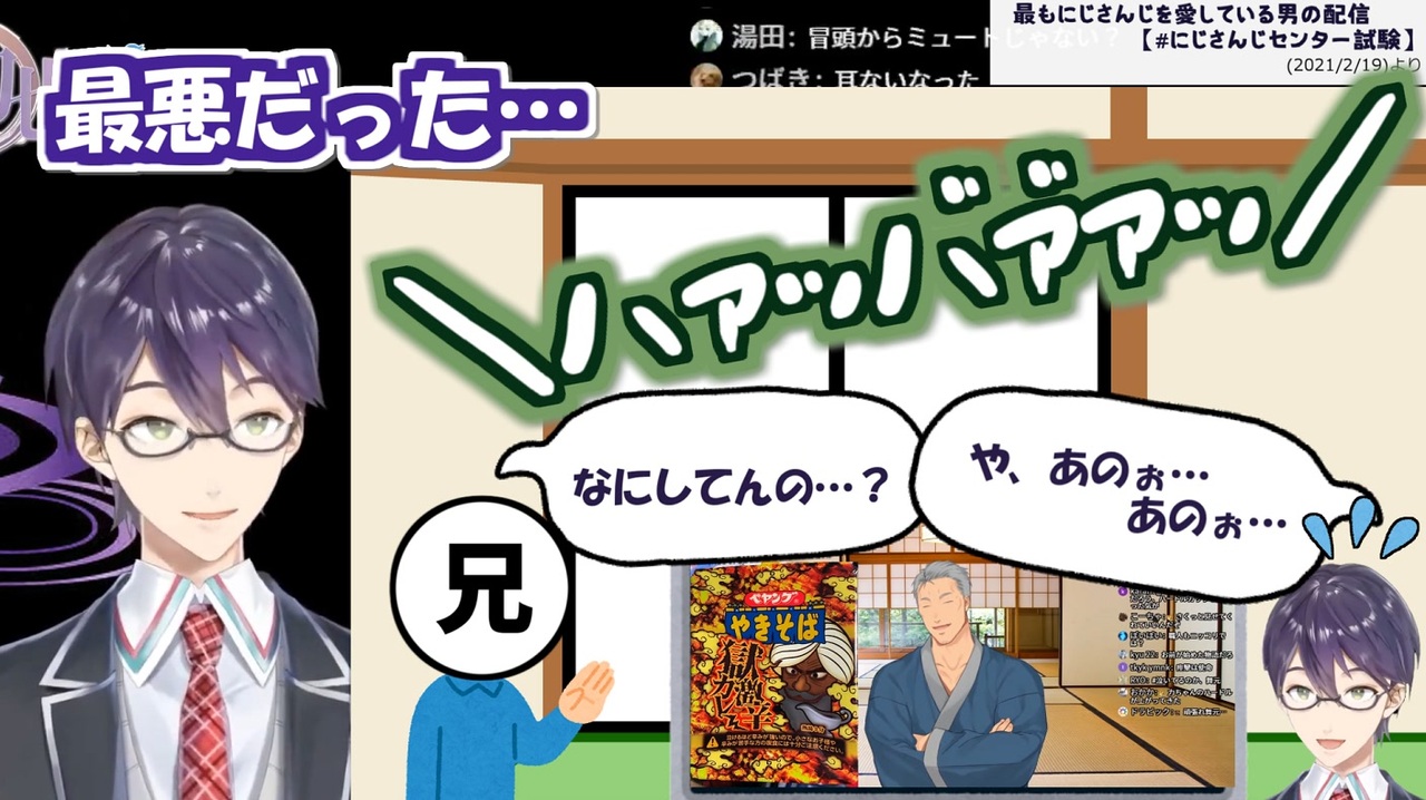 草<br>舞元啓介<br><a href="https://www.youtube.com/channel/UCJubINhCcFXlsBwnHp0wl_g?sub_confirmation=1" target="_blank" rel="noopener nofollow">https://www.youtube.com/channel/UCJubINhCcFXlsBwnHp0wl_g?sub_confirmation=1</a><br>剣持刀也<br><a href="https://www.youtube.com/channel/UCv1fFr156jc65EMiLbaLImw?sub_confirmation=1" target="_blank" rel="noopener nofollow">https://www.youtube.com/channel/UCv1fFr156jc65EMiLbaLImw?sub_confirmation=1</a><br><br>▼元動画<br>最もにじさんじを愛している男の配信【#にじさんじセンター試験】(2021/2/19)<br><a href="https://www.youtube.com/watch?v=7WCwwNuUbK0" target="_blank" rel="noopener nofollow">https://www.youtube.com/watch?v=7WCwwNuUbK0</a><br>該当箇所(6:41~)<br><a href="https://youtu.be/7WCwwNuUbK0?t=401" target="_blank" rel="noopener nofollow">https://youtu.be/7WCwwNuUbK0?t=401</a><br><br>【新衣装お披露目】三十路の禊(激ウマギャグ)【にじさんじ/舞元啓介】(2020/2/19)<br><a href="https://www.youtube.com/watch?v=bgNq7oqc6I4" target="_blank" rel="noopener nofollow">https://www.youtube.com/watch?v=bgNq7oqc6I4</a>