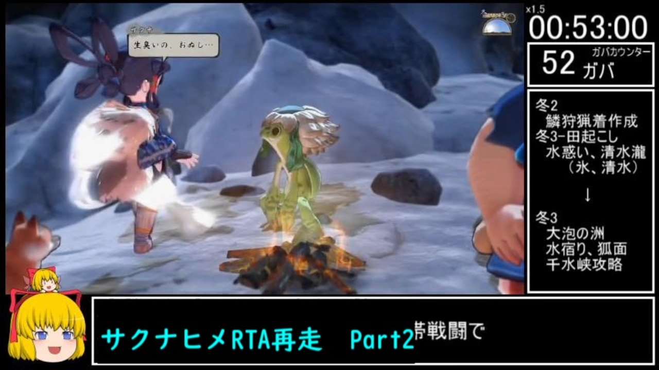 (買って2か月のバイクで立ちごけしたので)初投稿です。<br><br>この冬3日目がたぶんこのRTAの中で一番忙しい部分になります。<br>いつも通りのコメ返しもやります。できるだけ返していきます。じゃないと喋る内容がなくなってしまう<br><br>使用バージョン:Jan,7,2021<br>レギュレーション:Any% Low Glitchless<br>計測区間<br> 開始点:最初から選択時<br> 終了点:クリア後セーブする瞬間<br>難易度選択<br> 戦闘:低<br> 稲作:低<br>その他<br> バグなし(壁抜け無し、強制戦闘スキップ無し、肥溜め保存無し)レギュレーション<br><br>次→<a href="https://www.nicovideo.jp/watch/sm38331104" class="watch">sm38331104</a><br>Part1→<a href="https://www.nicovideo.jp/watch/sm38288675" class="watch">sm38288675</a><br>前走Part1→<a href="https://www.nicovideo.jp/watch/sm37966404" class="watch">sm37966404</a><br>標準RTAPart1→<a href="https://www.nicovideo.jp/watch/sm38142191" class="watch">sm38142191</a><br>マイリスト→<a href="https://www.nicovideo.jp/mylist/70187820" target="_blank" rel="noopener">mylist/70187820</a><br><br>RTA/TAのPart1集→<a href="https://www.nicovideo.jp/mylist/70191093" target="_blank" rel="noopener">mylist/70191093</a><br>縛.りプレイのPart1集→<a href="https://www.nicovideo.jp/mylist/70191091" target="_blank" rel="noopener">mylist/70191091</a>