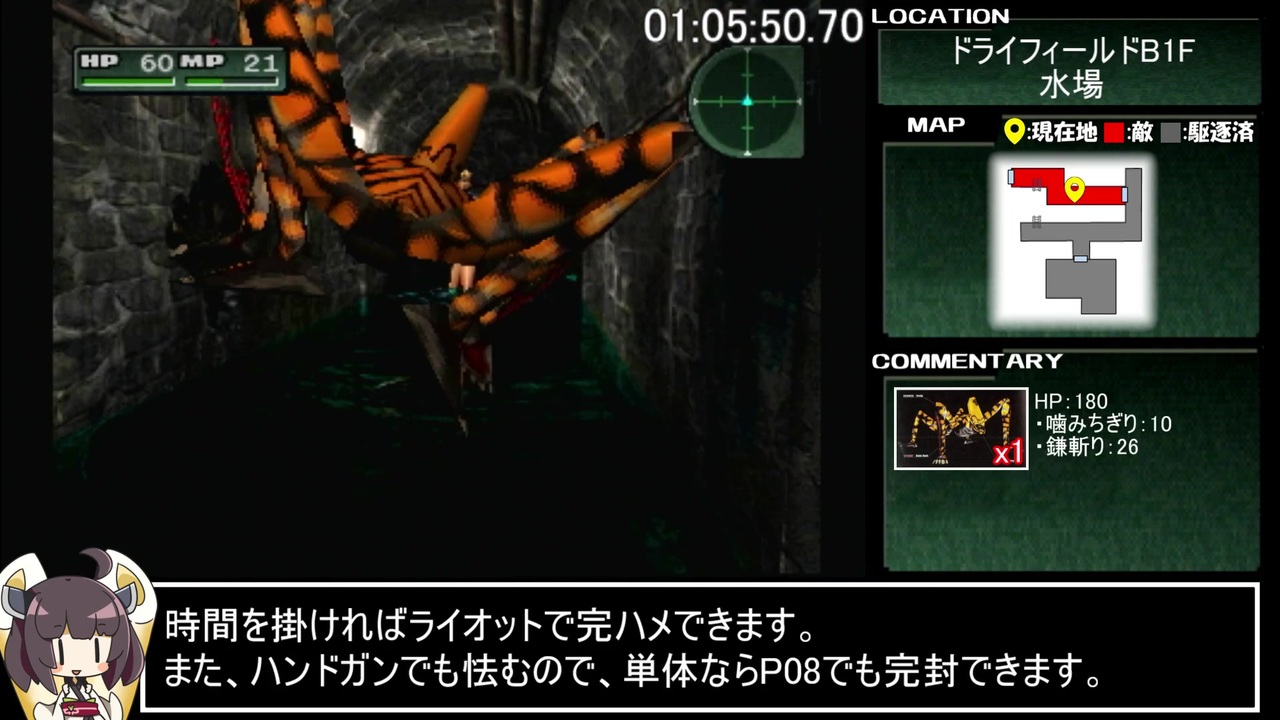 今回は殲滅メインです。なんか足んねえよな?(見所)<br><br>マップ画像はExcelのオートシェイプでシコシコ作っているのですが、<br>シェルターのマップ構造が複雑すぎて辞めたくなりますよ~編集ぅ~<br><br>ドライフィールド夜編開始~ガソリン献上まで<br><br><a href="https://www.nicovideo.jp/watch/sm38298270" class="watch">sm38298270</a>←前|<a href="https://www.nicovideo.jp/mylist/70540439" target="_blank" rel="noopener">mylist/70540439</a>|次→<a href="https://www.nicovideo.jp/watch/sm38357875" class="watch">sm38357875</a><br><br><strong><u>▼気まぐれQAコーナー</u></strong><br>Q1.PA3(3発装填のショットガン)は使わないの?<br>A1.サポートレス/デッドリーではPA3がお店に並ぶのはシェルターからで、<br> シェルターで上位互換のショットガンが手に入るため、いらない子です。<br><br>Q2.ガンブレードは拾う?<br>A2.M.I.S.T.センターで27800BPで売っている「メディソン・ウィール」を持っていると、<br> 2度目のNo.9戦の戦利品でもらえますが、引継ぎができないデッドリーでは、<br> 何をどうやってもドライフィールド出発までに27800BPを貯めるのは不可能なので、<br> メディソン・ウィールが入手できず、実質的にガンブレードも入手不可になっています。<br> (ダグラスさんはメディソン・ウィールは売ってくれません)<br><br>Q3.(水場のバット戦で)ライオットだと撃ち漏らすなら、ネクロ一択なのでは?<br>A3.一応ライオットで撃ち漏らさず1発で倒せれば、ネクロより数秒早いです。<br /><br><strong><u>▼環境</u></strong><br>・PS2実機、連射機なし、高速読み込みなし<br><br><strong><u>▼レギュレーション</u></strong><br>・計測期間:「デッドリーモード」選択~ラスボスに最後の一撃を与えた瞬間<br>・難易度:デッドリーモード<br>・最終セーブポイントで「駆逐率100%」を確認する<br>・ジャベリンバグ使用禁止<br>・(最終的に駆逐率100%であれば)逃走可<br><br>お借りしたきりたん立ち絵→<a href="https://seiga.nicovideo.jp/seiga/im8645890" target="_blank" rel="noopener">im8645890</a><br><br>ついた→<a href="https://twitter.com/KemotooooN_RTA" target="_blank" rel="noopener nofollow">https://twitter.com/KemotooooN_RTA</a><br><br>広告者様紹介は最後にドバーッと行う予定です。