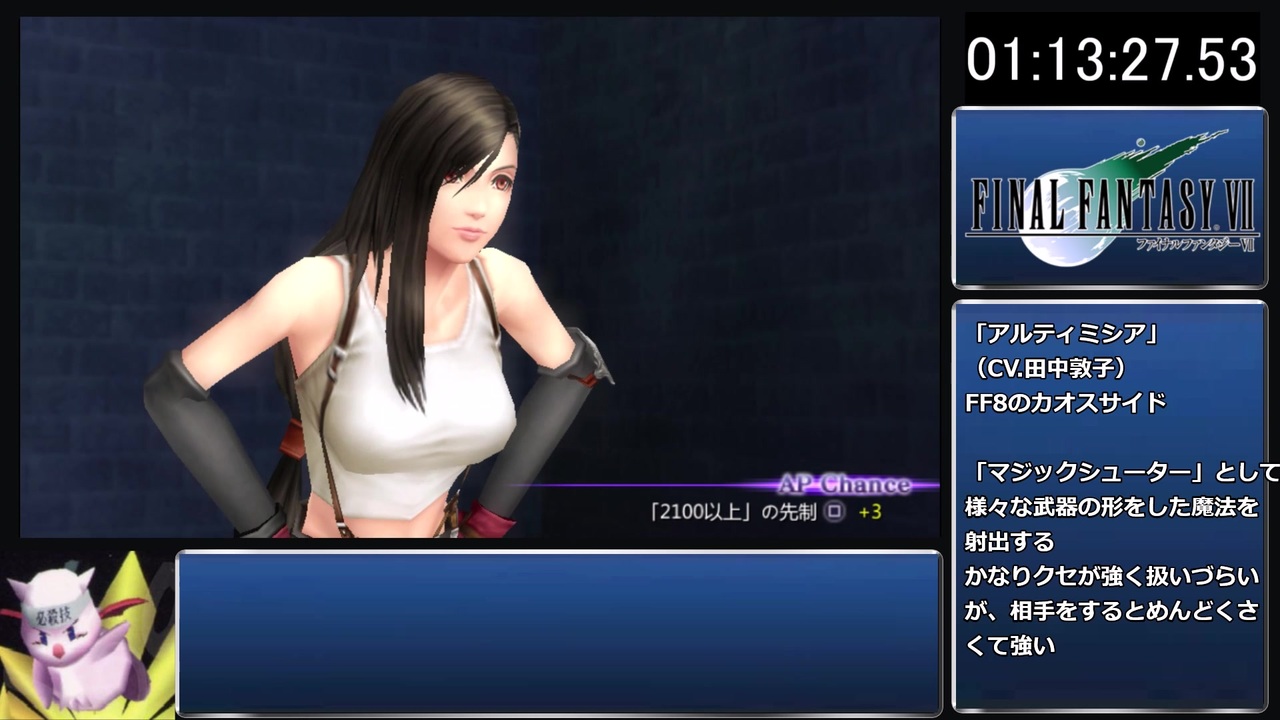 胸がでかすぎる<br><br>無料分でヴェインBT、その後10連でLD、チケ10連で雲BT引きました(隙自語)<br><br>(<a href="https://www.nicovideo.jp/watch/sm38302203" class="watch">sm38302203</a>)←前 <a href="https://www.nicovideo.jp/mylist/70529667" target="_blank" rel="noopener">mylist/70529667</a> 次→(<a href="https://www.nicovideo.jp/watch/sm38360020" class="watch">sm38360020</a>)<br>ティファ編~12回目ラストバトル前まで<br><br>12回目の参考→<a href="https://www.youtube.com/watch?v=TWp7gREHcSA" target="_blank" rel="noopener nofollow">https://www.youtube.com/watch?v=TWp7gREHcSA</a><br>-----------------------------------------------------------------------------------------------------------------<br>DDFF(デュオデシム)の13回目の戦いクリアRTAです。<br>エミュレーター使用しました<br>レギュレーションは以下の通り<br><br>①測定開始はNew Gameでセーブデータを作成して「戻る」を押した瞬間、終了はカオス3戦目でとどめのHPがヒットした瞬間<br>②エミュレーター使用の場合は明記すること<br>③DFF、プロログスのセーブデータの引き継ぎは禁止<br>④エミュレーター使用の場合、セーブステートの使用禁止<br>-----------------------------------------------------------------------------------------------------------------<br><br>DFFNT ストーリーモード100%RTA:<a href="https://www.nicovideo.jp/mylist/69596585" target="_blank" rel="noopener">mylist/69596585</a><br>DFFNT ストーリークリアRTA:<a href="https://www.nicovideo.jp/mylist/69418852" target="_blank" rel="noopener">mylist/69418852</a><br>DDFF 13回目クリアRTA:<a href="https://www.nicovideo.jp/mylist/70529667" target="_blank" rel="noopener">mylist/70529667</a><br>きたないほう:<a href="https://www.nicovideo.jp/mylist/70793848" target="_blank" rel="noopener">mylist/70793848</a><br>