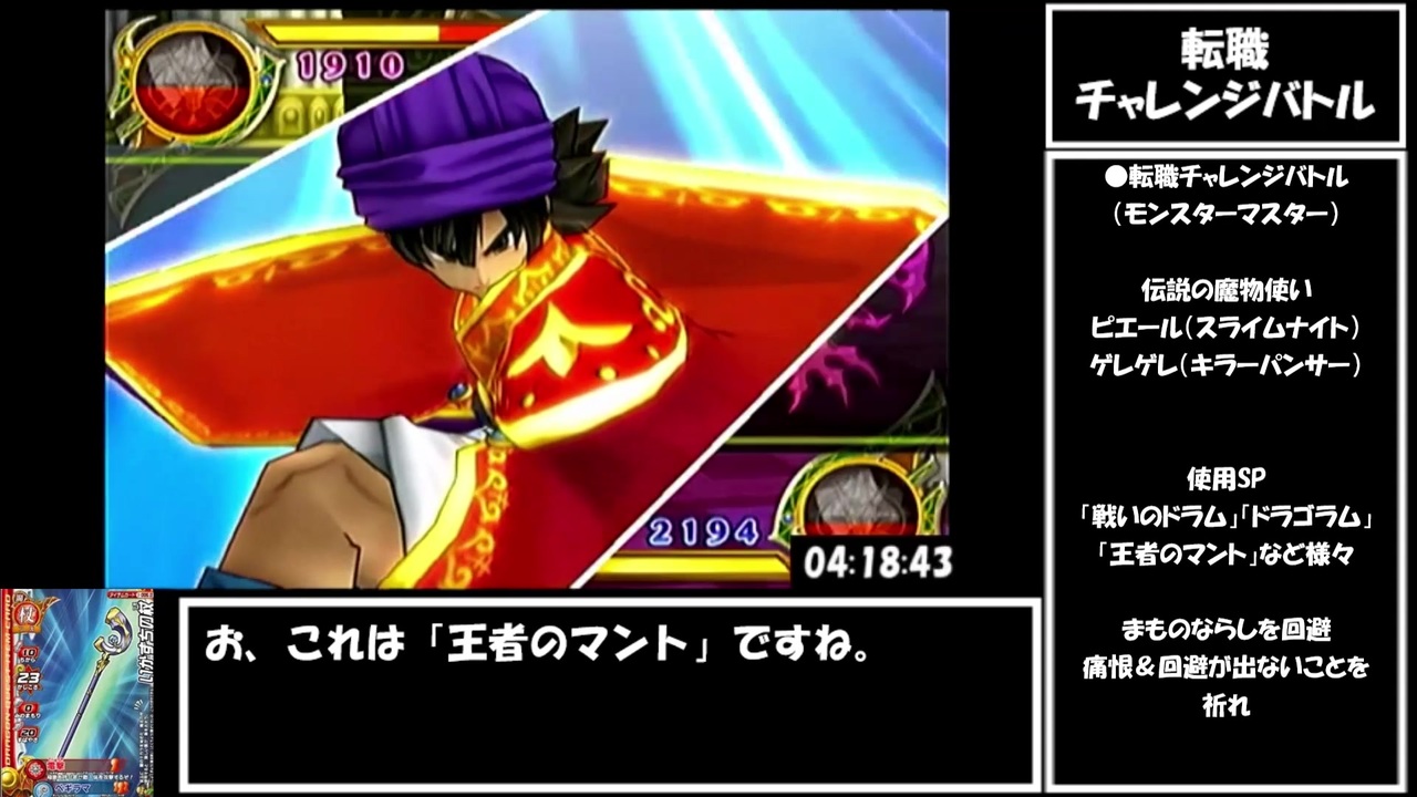 モンスターマスターの内定を頂けたので初投稿です。<br><br>動画内でも話しているけど、これ以降暇な時間がないから<br>大魔王のとどめの一撃や合体モンスターのワザを流す予定はないゾ。<br>それらは宇宙一決定戦RTAの時に流す予定だけど、こういうのは<br>実際にやって観たほうが何十倍も感動するから、みんなも<br>DQMBVを買ってやってみようね!(宣伝)<br><br>転職チャレンジバトル(モンマス)~モンスターマスター大会制覇まで<br><br><a href="https://www.nicovideo.jp/watch/sm38325726" class="watch">sm38325726</a>←前 <a href="https://www.nicovideo.jp/mylist/70541906" target="_blank" rel="noopener">mylist/70541906</a> 次→<a href="https://www.nicovideo.jp/watch/sm38340085" class="watch">sm38340085</a><br>今回のチャート解説:<a href="https://ch.nicovideo.jp/article/ar2000235" target="_blank" rel="noopener">ar2000235</a><br><br>生放送用を行うコミュ co4518186<br>Twitter:<a href="https://twitter.com/imomushidq8" target="_blank" rel="noopener nofollow">https://twitter.com/imomushidq8</a><br><br><br>この動画で利用している株式会社スクウェア・エニックスを代表とする共同著作者が権利を所有する著作物及びスギヤマ工房有限会社が権利を所有する楽曲の転載・配布は禁止いたします。<br>© 2004 ARMOR PROJECT/BIRD STUDIO/LEVEL-5/SQUARE ENIX All Rights Reserved.<br>© SUGIYAMA KOBO<br><br>