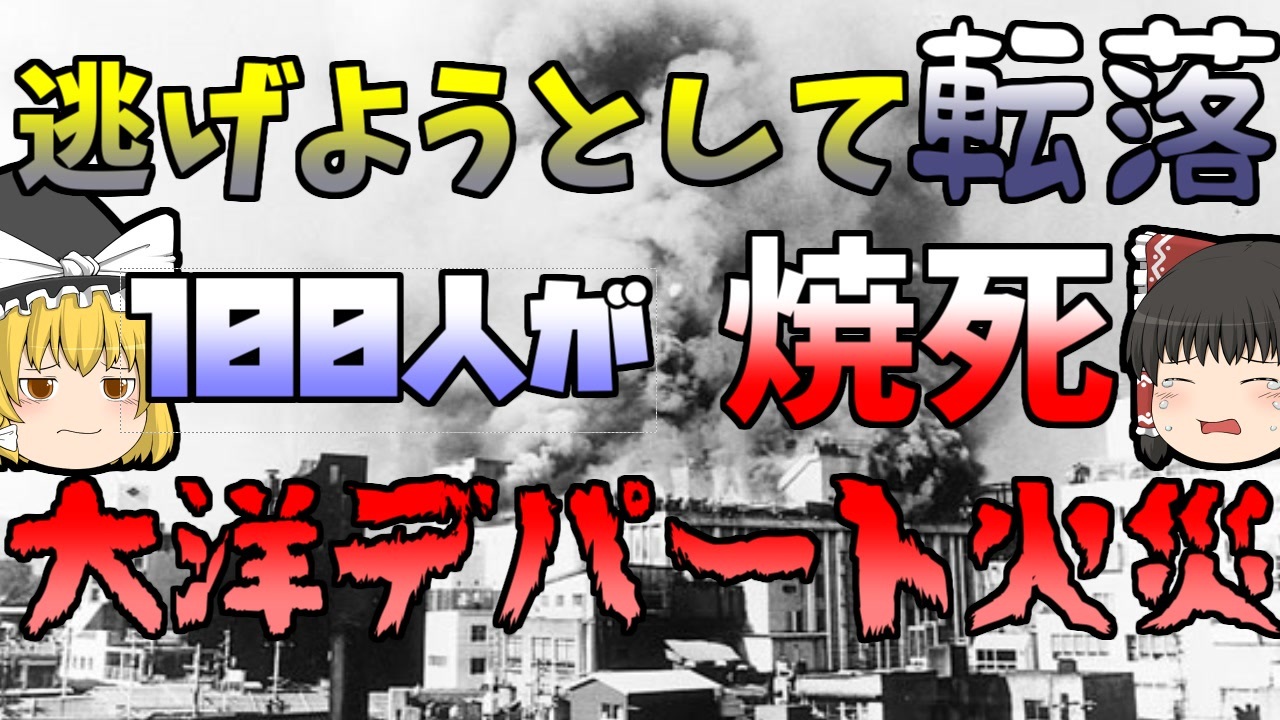 今回は、いくつかリクエストを頂いていた『大洋デパート火災事件』の紹介です。<br>出火原因は定かではありませんが、この火災も会社の管理体制、教育不足、防火設備、意識の不足などに起こってしまった人災の類と言えるでしょう。<br>この火災は、百貨店火災の中では史上最悪のものと言われているそうです。<br><br><br>引用:出典:参考<br>gooニュース<br><a href="https://ishort.ink/mv6b" target="_blank" rel="noopener nofollow">https://ishort.ink/mv6b</a><br>熊本ぼちぼち新聞<br><a href="https://ishort.ink/omxW" target="_blank" rel="noopener nofollow">https://ishort.ink/omxW</a><br>TKUテレビ熊本<br><a href="https://ishort.ink/zJwt" target="_blank" rel="noopener nofollow">https://ishort.ink/zJwt</a><br><a href="https://ishort.ink/izn8" target="_blank" rel="noopener nofollow">https://ishort.ink/izn8</a><br>Wikipedia<br><a href="https://ishort.ink/kkYx" target="_blank" rel="noopener nofollow">https://ishort.ink/kkYx</a><br>消防博物館<br><a href="https://ishort.ink/ZC3V(pdf)" target="_blank" rel="noopener nofollow">https://ishort.ink/ZC3V(pdf)</a><br>写真集『日本の火災』<br><a href="https://ishort.ink/L7LQ" target="_blank" rel="noopener nofollow">https://ishort.ink/L7LQ</a><br><br />※この動画は過去の事件を知り、現在でも同じことが発生する危険性を再認識、関与しないように促すための動画であり、視聴者を扇動、動揺を誘うためのコンテンツではありません。<br><br>ご要望にお応えして、メンバーシップの開設を行いました。<br>下記URLからも登録可能ですので、ご興味がある方は是非ご参加ください。<br><a href="https://www.youtube.com/channel/UCcT5a1J7XJW7CLYI2RKl4pw/join" target="_blank" rel="noopener nofollow">https://www.youtube.com/channel/UCcT5a1J7XJW7CLYI2RKl4pw/join</a><br><br><br>Twitter<br>→<a href="https://twitter.com/yukkurisurutoko" target="_blank" rel="noopener nofollow">https://twitter.com/yukkurisurutoko</a><br><br>取り急ぎ、簡易的にですがマイリストを作りました。<br>【ゆっくり解説】事故・事件関係紹介リスト <br><a href="https://www.nicovideo.jp/mylist/71034319" target="_blank" rel="noopener nofollow">https://www.nicovideo.jp/mylist/71034319</a><br>【ゆっくり解説】放射線系事故<br><a href="https://www.nicovideo.jp/mylist/71034368" target="_blank" rel="noopener nofollow">https://www.nicovideo.jp/mylist/71034368</a><br>【ゆっくり解説】鉄道系事故・事件関連<br><a href="https://www.nicovideo.jp/mylist/71034379" target="_blank" rel="noopener nofollow">https://www.nicovideo.jp/mylist/71034379</a>