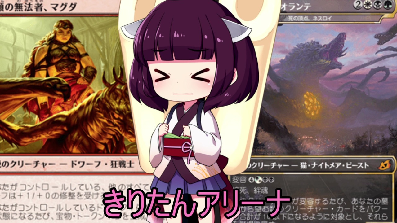 配信用のスタンプを新しく3個描いてもらいました。お気に入りは右手が光った時に使う用のバンデットきりたん<br><br>【アリーナ公式】<br><a href="https://magic.wizards.com/en/mtgarena" target="_blank" rel="noopener nofollow">https://magic.wizards.com/en/mtgarena</a><br><span style="color: #000000; font-size: 14px;">【配信】(毎日20~22時)</span><br><a href="https://www.twitch.tv/kiritanex" target="_blank" rel="noopener nofollow">https://www.twitch.tv/kiritanex</a><br><br><span style="color: #000000; font-size: 14px;">【前回の広告者様動画】</span><br>林原めぐみ好きのおっちゃん様:「ゆかマキMTG実況」<a href="https://www.nicovideo.jp/series/155646" target="_blank" rel="noopener">series/155646</a><br>ゲダメ様:「ジトメガネきりたんのMTGファンデッキ」<a href="https://www.nicovideo.jp/series/116313" target="_blank" rel="noopener">series/116313</a><br>ジェノサイドキングサーモン様:「楽しむ!MTGアリーナ!!」<a href="https://www.nicovideo.jp/mylist/64584602" target="_blank" rel="noopener">mylist/64584602</a><br>TKY様:「弦巻 The Gathering」<a href="https://www.nicovideo.jp/series/173355" target="_blank" rel="noopener">series/173355</a><br>白ウイスキー様:「アリーナのアは茜ちゃんのア」<a href="https://www.nicovideo.jp/mylist/69289902" target="_blank" rel="noopener">mylist/69289902</a><br>AHE様:「MTG一人対戦」<a href="https://www.nicovideo.jp/mylist/54219502" target="_blank" rel="noopener">mylist/54219502</a><br>BlueSky様:「【MTGA】ドラフトで遊ぶ」<a href="https://www.nicovideo.jp/mylist/67869251" target="_blank" rel="noopener">mylist/67869251</a><br>まいな様:「東北イタコの今日から始めるMTGアリーナ」<a href="https://www.nicovideo.jp/watch/sm34972717" class="watch">sm34972717</a><br>nununu様:「フェイ庄の古老で無限コンボ!、他」<a href="https://www.nicovideo.jp/mylist/66711538" target="_blank" rel="noopener">mylist/66711538</a><br>Luin様:「PWあかりのアリーナ対戦録」<a href="https://www.nicovideo.jp/mylist/66293742" target="_blank" rel="noopener">mylist/66293742</a><br>Toko様:「結月ゆかりのフレーバー書庫」<a href="https://www.nicovideo.jp/series/198115" target="_blank" rel="noopener">series/198115</a><br>benz様:「ノーローグノーライフ」<a href="https://www.nicovideo.jp/mylist/68541419" target="_blank" rel="noopener">mylist/68541419</a><br>らんぽす様:「ティミーなあかりちゃんは遊びたい」<a href="https://www.nicovideo.jp/series/143123" target="_blank" rel="noopener">series/143123</a><br>血染めのダイチ様:「ODDS & ENDS」<a href="https://www.nicovideo.jp/series/176669" target="_blank" rel="noopener">series/176669</a><br>ものまねうさぎ様:「初心者でもモダンがしたい!」<a href="https://www.nicovideo.jp/watch/sm32508742" class="watch">sm32508742</a><br>楓塔也様:「オーラがきらきらきんようび!」<a href="https://www.nicovideo.jp/watch/sm36929434" class="watch">sm36929434</a><br>稲尾様:「とにかくタフネスで殴り抜ける。」<a href="https://www.nicovideo.jp/mylist/66067276" target="_blank" rel="noopener">mylist/66067276</a><br>ラーメン王様:「結月ゆかりのミラクル解説ラジオ」<a href="https://www.nicovideo.jp/mylist/62359037" target="_blank" rel="noopener">mylist/62359037</a><br>黒音紅様:「MTGアリーナボイスロイド実況!」<a href="https://www.nicovideo.jp/series/176380" target="_blank" rel="noopener">series/176380</a><br>konishi様:「【ゆっかりM O】ほろよいマジック」<a href="https://www.nicovideo.jp/mylist/58382838" target="_blank" rel="noopener">mylist/58382838</a><br>TEPIA様:「紲星あかりはライブラリーをめくりたい」<a href="https://www.nicovideo.jp/watch/sm35229450" class="watch">sm35229450</a><br><br><a href="https://www.nicovideo.jp/mylist/63851869" target="_blank" rel="noopener">mylist/63851869</a> 前:<a href="https://www.nicovideo.jp/watch/sm38317599" class="watch">sm38317599</a> 次:<a href="https://www.nicovideo.jp/watch/sm38395116" class="watch">sm38395116</a>