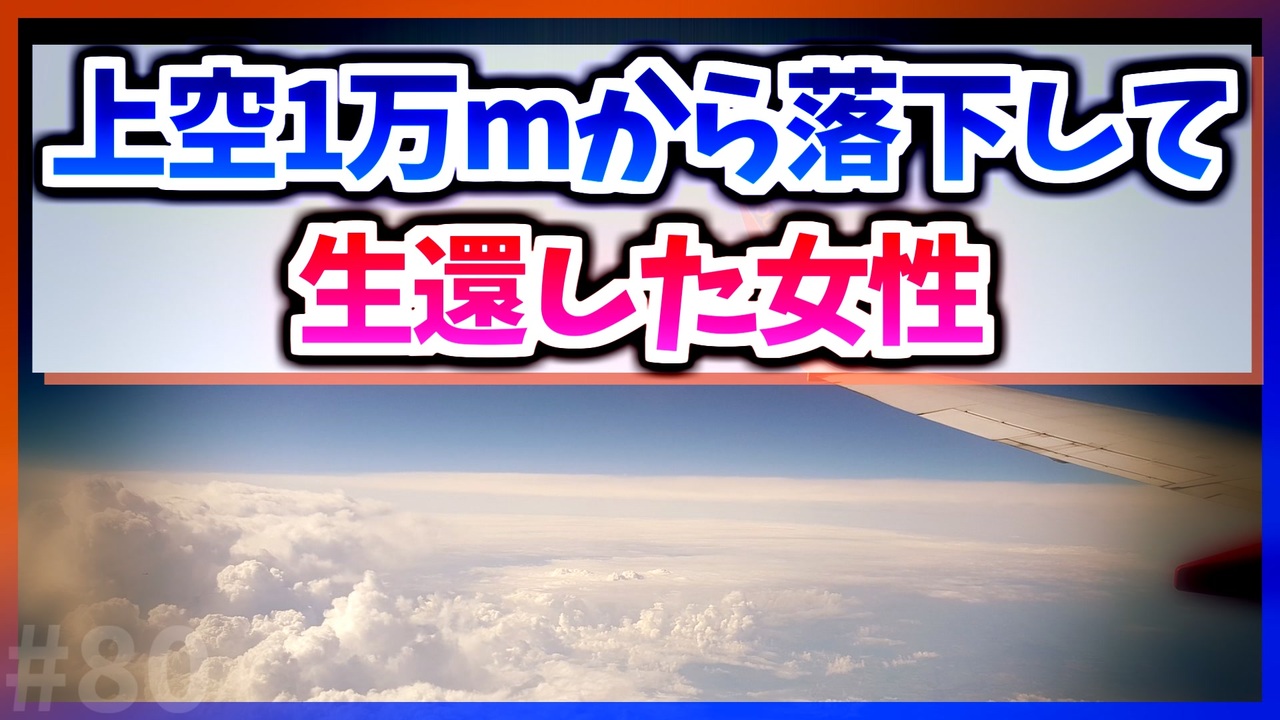 今日の豆知識は「高度1万mから落下して生還した女性」です。<br>人間は45m以上の高さから落ちた場合、ほぼ確実に死に至るといわれていますが、なんと上空1万mから落下して生還した女性がいるんです。<br><br><br><span style="font-size: 16px;"><strong>「いいね!」に追加の豆知識書いてます。</strong></span><br><br>今日の豆知識シリーズでは、毎日、様々なジャンルの豆知識を紹介していきます。<br>このシリーズは音声のみで、ラジオ感覚で聞くこともできます。<br>基本毎日投稿です!<br><br>コメントやいいね、マイリストなどしていただけるとモチベにつながるのでよければお願いします。<br><br>前【<a href="https://www.nicovideo.jp/watch/sm38348888" class="watch">sm38348888</a>】<br>次【<a href="https://www.nicovideo.jp/watch/sm38362498" class="watch">sm38362498</a>】<br><br /><br><span style="font-size: 16px;"><strong>各シリーズPart1リンク</strong></span><br>【海外の気になるQ&A】<br><a href="https://www.nicovideo.jp/watch/sm42996236" class="watch">sm42996236</a><br>【今日の豆知識】<br><a href="https://www.nicovideo.jp/watch/sm38740531" class="watch">sm38740531</a><br>【テクノロジーの歴史】<br><a href="https://www.nicovideo.jp/watch/sm37218295" class="watch">sm37218295</a><br><br>▶ Youtube<br><a href="https://www.youtube.com/channel/UCgb_Wn-ZUdVM3MTLiVHhcXQ?sub_confirmation=1" target="_blank" rel="noopener nofollow">https://www.youtube.com/channel/UCgb_Wn-ZUdVM3MTLiVHhcXQ?sub_confirmation=1</a><br>▶ Twitter<br><a href="https://twitter.com/RayKemo" target="_blank" rel="noopener nofollow">https://twitter.com/RayKemo</a>