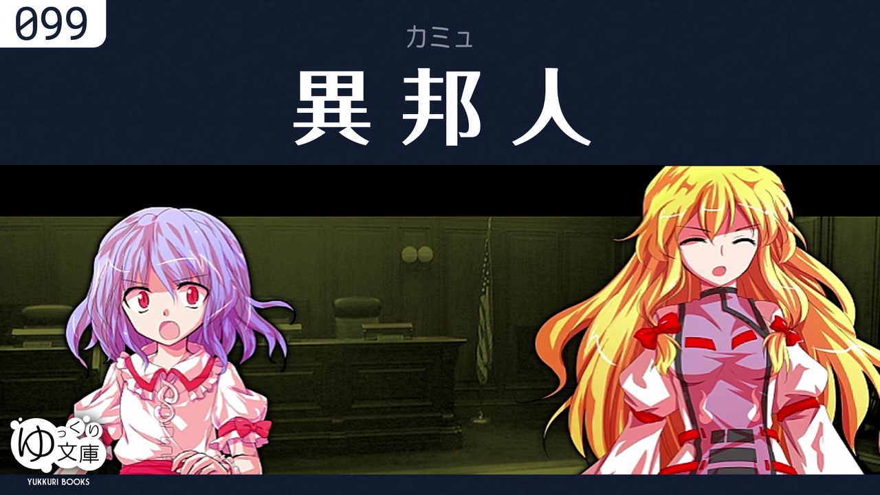 <span style="color: red;"><strong>099 太陽がまぶしかったから──</strong></span><br>フランス領アルジェリアにて。青年ムルソーは隣人のトラブルに巻き込まれ、アラビア人を射殺してしまう。裁判は事件とは関係ないことで紛糾した。<br><span style="color: green;">L'Étranger (1942) de d'Albert Camus</span><br><br>(うp主より)表現も内容も変わり種。ムルソーは異常者だったのか? 稚拙な反逆だったのか? 不条理におもねることは当然か? 私にも答えはわかりません。<br>編集後記:<a href="https://trynext.com/story/ybook/yb099.php" target="_blank" rel="noopener nofollow">https://trynext.com/story/ybook/yb099.php</a><br><br>(コラボ)本作は、めれんげさん(<a href="https://www.nicovideo.jp/user/22327320" target="_blank" rel="noopener">user/22327320</a>)とのコラボです。私が本編、めれんげさんがスピンオフ(別視点・別解釈)を投稿しています。<br><a href="https://www.nicovideo.jp/watch/sm38371421" class="watch">sm38371421</a> 【ゆっくり文庫リスペクト】異邦人 if ある看守の思い出話<br><br>●ゆっくり文庫について<br>全部:<a href="https://www.nicovideo.jp/mylist/74874627" target="_blank" rel="noopener">mylist/74874627</a><br>近況:<a href="https://twitter.com/trynext" target="_blank" rel="noopener nofollow">https://twitter.com/trynext</a><br>---<br><br>