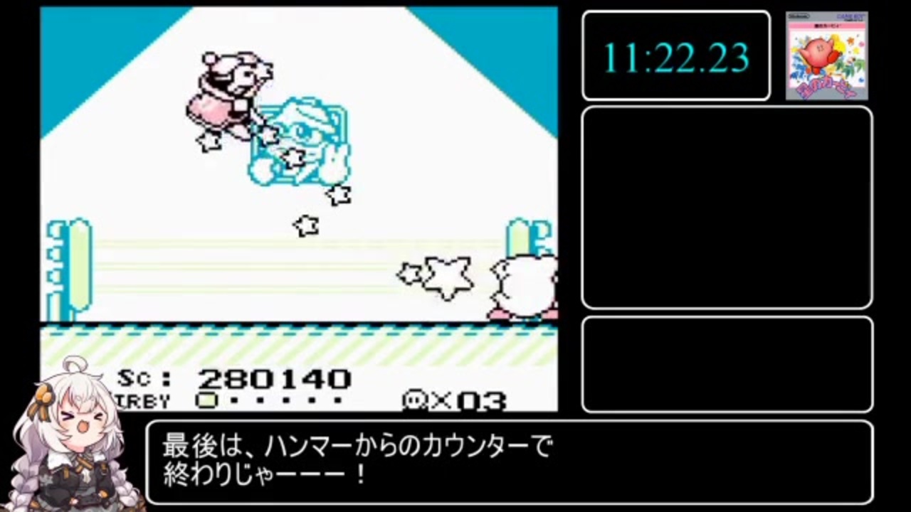 正真正銘初投稿です。<br>speedrun.com記載のルールに基づいて走りました。<br><br>【計測区間】<br>タイトル画面でスタートボタンを押した瞬間~デデデ大王撃破時<br><br>【プレイ環境】<br>使用機器:レトロフリーク<br>タイマー後乗せ<br><br>【参考にさせて頂いた先駆者兄貴】<br>生肉定食兄貴 ⇒ <a href="https://www.nicovideo.jp/watch/sm33189556" class="watch">sm33189556</a><br>(この動画で説明不足のところも解説されております。ぜひご視聴ください!)<br><br>【お借りしたあかりちゃん立ち絵の絵師様】<br>ふーれん様 ⇒ <a href="https://seiga.nicovideo.jp/seiga/im10551050" target="_blank" rel="noopener">im10551050</a><br>(動画のイメージにぴったりでしたのでお借りしました。かわいい!愛でたい!)<br><br>※2021/5/16 1:21追記<br> コメント返信用の動画を作成しました。<br> よろしければご視聴ください。 ⇒ <a href="https://www.nicovideo.jp/watch/sm38737635" class="watch">sm38737635</a>