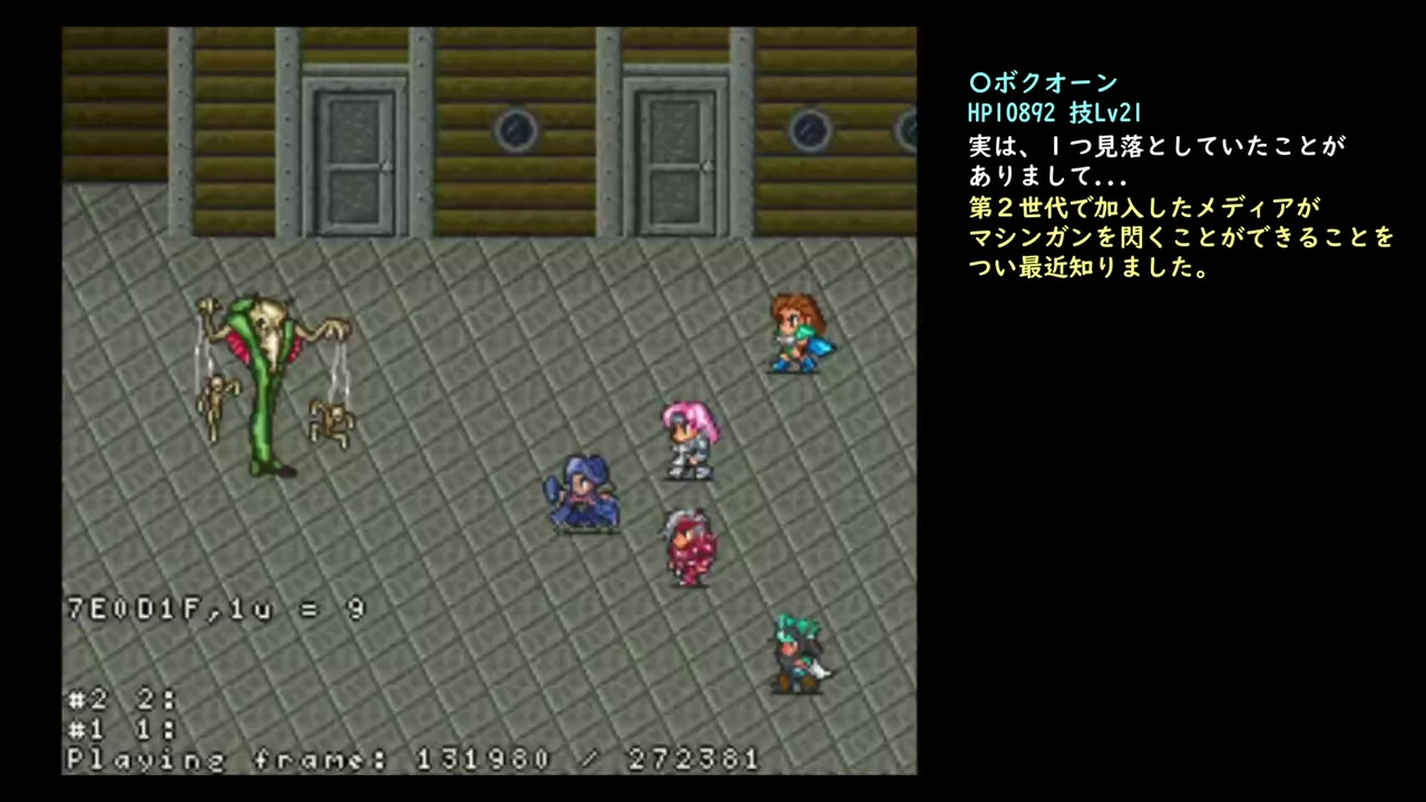 まさか投稿が被るとは思いもよらなかった...<br>完結期待しております。<a href="https://www.nicovideo.jp/watch/sm38379085" class="watch">sm38379085</a><br><br>総フレーム数:272,381 追記:5,980<br>制作期間:1か月ぐらい<br><br>Part3→<a href="https://www.nicovideo.jp/watch/sm38414638" class="watch">sm38414638</a><br><br>※追記:本シリーズの解説について<br>自分は今までの経験を基にしたルート取りをしているのですが、<span style="color: #ff0000;"><strong>多種多様と言えるルートや<br>戦略・戦術に対して全てフレーム単位で検証しているわけではなく、半分以上は主観的な<br>意見と捉えていただきたいです。</strong></span><br>なので、今回示したルート・解説が絶対、と言うわけではなく、<span style="color: #262626;"><strong>投稿者に対して疑問を持つような<br>視点で視聴していただけると、投稿者としてもうれしい限りです。</strong></span><br><br>※追記:解説間違い<br>斧MLV7に到達したのはヘルハウンド戦ではなくボクオーン戦でした。第2世代ラストのリザードの150点と、ボクオーンの1250点で足りてますね。まぁ大筋的には問題ない内容ですが。<br><br>
