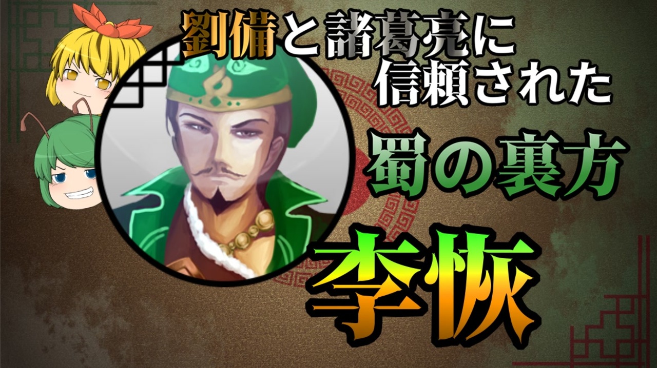 この動画は東方projectの二次創作です。AquesTalkライセンス購入済み。<br> <br>◇反三国志二次創作同人誌「叔漢二國史」<a href="https://danxiawangchao.booth.pm/items/2029329" target="_blank" rel="noopener nofollow">https://danxiawangchao.booth.pm/items/2029329</a><br><br>三国志のメジャーではないけれど面白い人物や評価されるべき人物を紹介していきます。<br>蜀にとって、国家をあげての一大事業といえば北伐です。<br>諸葛亮が主導した北伐は、彼が亡くなるまでおよそ年1回ペースの5回にわたって敢行され、国力は大きく消耗されることも想像に難くありません。<br>しかしその裏では、北伐を円滑に進めるために働く力もあったのです。<br>今回紹介する李恢は、南方より北伐を支え、国の財力を潤わせた人物でした。<br>それでは彼の生涯を、劉備以前の時代より追っていきましょう。<br><br>▷第三十二回「短編集」<a href="https://www.nicovideo.jp/watch/sm38316430" class="watch">sm38316430</a><br>▷第三十四回「武安国」<a href="https://www.nicovideo.jp/watch/sm38530218" class="watch">sm38530218</a><br><br>◆◆◆◆◆◆◆◆◆◆◆◆◆◆◆◆◆◆◆◆◆◆◆<br>参考文献、補足など<br>亶夏王朝府 <a href="https://danxiawangchao.hatenablog.com/" target="_blank" rel="noopener nofollow">https://danxiawangchao.hatenablog.com/</a><br>この動画の参考文献 <a href="https://danxiawangchao.hatenablog.com/entry/2021/03/16/222509" target="_blank" rel="noopener nofollow">https://danxiawangchao.hatenablog.com/entry/2021/03/16/222509</a><br><br>この動画のイラストまとめ<br>Pixiv <a href="https://www.pixiv.net/users/1062979" target="_blank" rel="noopener nofollow">https://www.pixiv.net/users/1062979</a><br>ニコニコ静画 <a href="https://seiga.nicovideo.jp/seiga/im10712352" target="_blank" rel="noopener">im10712352</a><br>BOOTH <a href="https://danxiawangchao.booth.pm/items/2825422" target="_blank" rel="noopener nofollow">https://danxiawangchao.booth.pm/items/2825422</a><br><br>YouTubeにもアップロードしています。よろしければ評価、チャンネル登録よろしくお願いします。<br><a href="https://youtu.be/j6RkrUta7l4" target="_blank" rel="noopener nofollow">https://youtu.be/j6RkrUta7l4</a><br>◆◆◆◆◆◆◆◆◆◆◆◆◆◆◆◆◆◆◆◆◆◆◆<br><br>音楽効果音提供<br>チンドン演歌/藁谷 隆 様<br>テーマ10/魔王魂 様<br>民族11 骨祭り/魔王魂 様<br>計画通り/田中芳典 様<br>黄金金魚/こおろぎ 様<br>効果音提供/効果音ラボ 様<br>