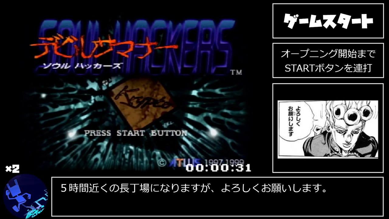 先駆者様の記録を6年ぶりに更新です。<br>きっかけをくれた先駆者様:<a href="https://www.nicovideo.jp/watch/sm27163298" target="_blank" rel="noopener nofollow">https://www.nicovideo.jp/watch/sm27163298</a><br><br>プレイ環境:PlayStation 2<br>計測区間:「電源ON」から「ラスボスに最後のダメージを与える」まで<br>条件:any%<br><br>チャートはこちらになります↓<br><a href="http://cliverta.web.fc2.com/chart/SoulHackers.html" target="_blank" rel="noopener nofollow">http://cliverta.web.fc2.com/chart/SoulHackers.html</a><br><br>近況報告などはTwitterにしてますので、よろしければフォローお願いします。<br>Twitter:<a href="https://twitter.com/Clive_RTA" target="_blank" rel="noopener nofollow">https://twitter.com/Clive_RTA</a><br>Twitch:<a href="https://www.twitch.tv/clive_rta/" target="_blank" rel="noopener nofollow">https://www.twitch.tv/clive_rta/</a><br>Speedrun.com:<a href="https://www.speedrun.com/user/Clive" target="_blank" rel="noopener nofollow">https://www.speedrun.com/user/Clive</a><br><br>Part 2→<a href="https://www.nicovideo.jp/watch/sm38531651" class="watch">sm38531651</a><br>Part 1→ここ<br>マイリスト→作成中<br><br>【追記】<br>あぁ~!!「ATLUS」の表記間違ってる~!!<br>「アトラス」から変換して「ATLAS」にしてしまってた・・・すんません。