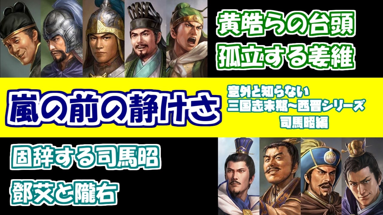 <span style="font-size: 24px;">「嵐の前の静けさ」なんてタイトルだけど静かではない。</span><br><br><br>今回は「固辞する司馬昭・鄧艾と隴右・蜀漢の内情」の3本を紹介します。<br>司馬懿を取り上げた動画を上げて以来…<br>いよいよ来るとこまで来ました。<br><br>司馬昭は高貴郷公の件が尾を引いている感じですね。<br>一方の鄧艾はしっかりと役目を果たしていて頼もしい限りです。<br><br>蜀漢の内情は詳しくは触れられませんでしたが<br>黄皓らと姜維は向いている方向が違うのかなと感じました。<br><br><br>動画上で引用及び参考サイトとして紹介している<br>季漢書 さんはこちらから<br>「景耀五年 第六次北伐-侯和の戦い」<br><a href="http://blog.livedoor.jp/jominian/archives/8417958.html" target="_blank" rel="noopener nofollow">http://blog.livedoor.jp/jominian/archives/8417958.html</a><br><br>「泰始六年~咸寧五年 樹機能の乱」<br><a href="http://blog.livedoor.jp/jominian/archives/19215255.html" target="_blank" rel="noopener nofollow">http://blog.livedoor.jp/jominian/archives/19215255.html</a><br><br><br>【前回】<a href="https://www.nicovideo.jp/watch/sm38315576" class="watch">sm38315576</a> <span style="color: #000000; font-size: 14px;">【次回】</span><a href="https://www.nicovideo.jp/watch/sm38647216" class="watch">sm38647216</a><br><br>【司馬懿編(初回)はコチラ】<a href="https://www.nicovideo.jp/watch/sm36990322" class="watch">sm36990322</a><br>【司馬師編(初回)はコチラ】<a href="https://www.nicovideo.jp/watch/sm37497385" class="watch">sm37497385</a><br>【司馬昭編(初回)はコチラ】<a href="https://www.nicovideo.jp/watch/sm37739249" class="watch">sm37739249</a><br><br>【マイリスト】司馬懿編:<a href="https://www.nicovideo.jp/mylist/68597625" target="_blank" rel="noopener">mylist/68597625</a><br> 司馬師編:<a href="https://www.nicovideo.jp/mylist/69532627" target="_blank" rel="noopener">mylist/69532627</a><br> 番外編:<a href="https://www.nicovideo.jp/mylist/69831552" target="_blank" rel="noopener">mylist/69831552</a><br><br>