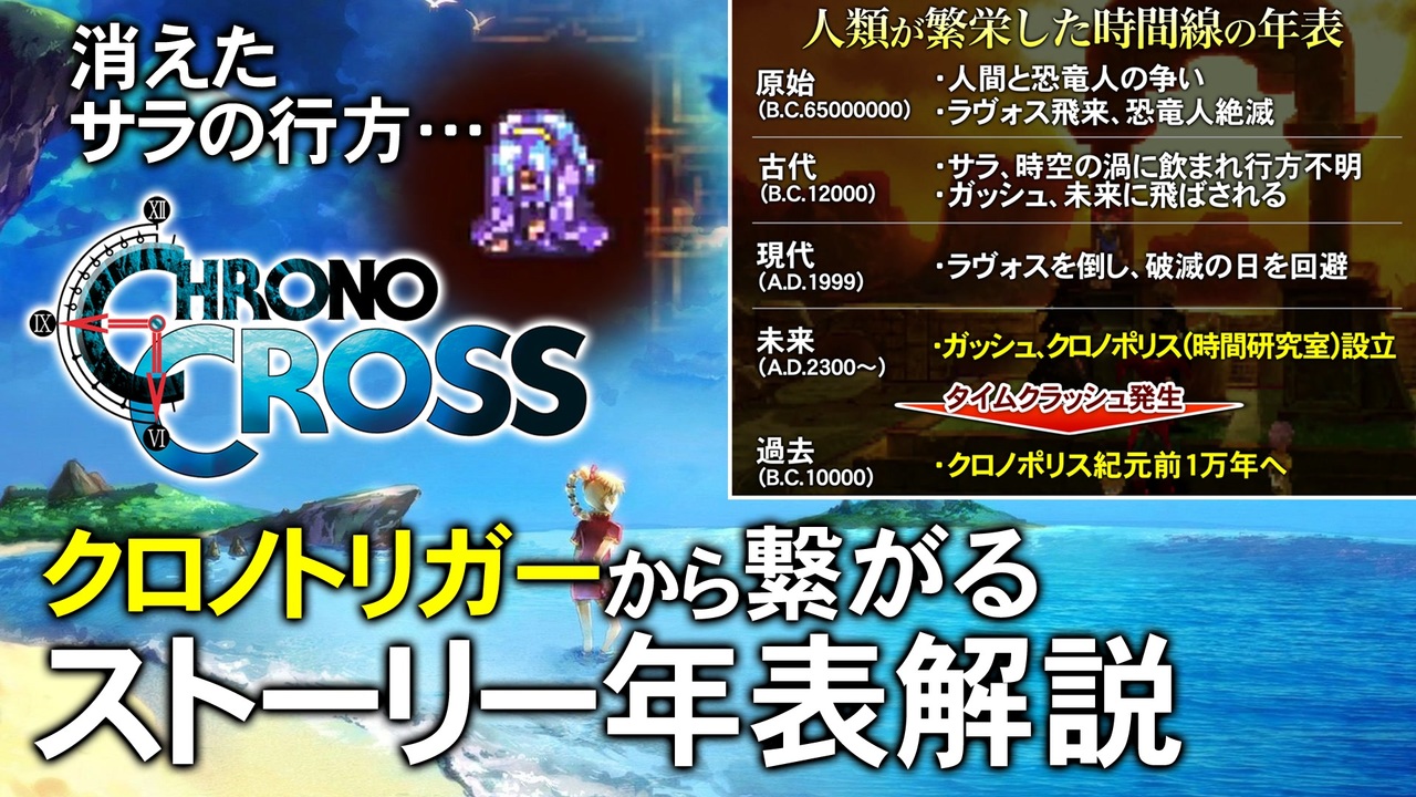 過去動画を宣伝して下さった皆さん、ありがとうございましたm(__)m<br>毎回ひとつのゲームを取り上げ、3つのテーマから解説&考察します。<br>【前編】は毎月1日・15日更新、【後編】は制作状況に応じて更新致します。<br><br><strong>第95回「クロノ・クロス」</strong><br>■前編:<a href="https://www.nicovideo.jp/watch/sm38447058" class="watch">sm38447058</a><br>■後編:<a href="https://www.nicovideo.jp/watch/sm38511060" class="watch">sm38511060</a><br><br>▼関連動画<br><strong>第45回「クロノ・トリガー」</strong><br>前編:<a href="https://www.nicovideo.jp/watch/sm34324576" class="watch">sm34324576</a>(誕生秘話・タイムトラベルのシナリオについて)<br>後編:<a href="https://www.nicovideo.jp/watch/sm34369845" class="watch">sm34369845</a>(ストーリーの考察)<br><br>■youtubeはこちら <a href="https://youtu.be/FQP8pR579K0" target="_blank" rel="noopener nofollow">https://youtu.be/FQP8pR579K0</a><br>■ゲーム夜話ツイッター <a href="https://twitter.com/gameyawa" target="_blank" rel="noopener nofollow">https://twitter.com/gameyawa</a><br><br>■第94回「ダークソウル」<br>前編:<a href="https://www.nicovideo.jp/watch/sm38354162" class="watch">sm38354162</a> 中編:<a href="https://www.nicovideo.jp/watch/sm38409820" class="watch">sm38409820</a> 後編:<a href="https://www.nicovideo.jp/watch/sm38414831" class="watch">sm38414831</a><br>■第96回「ラスアス2」<br>前編:<a href="https://www.nicovideo.jp/watch/sm38521781" class="watch">sm38521781</a> 後編:<a href="https://www.nicovideo.jp/watch/sm38568452" class="watch">sm38568452</a><br><br>■ゲーム夜話マイリスト <a href="https://www.nicovideo.jp/mylist/56973971" target="_blank" rel="noopener">mylist/56973971</a><br><br><span style="color: #000000; font-size: 13px;">■ゲームジャンル別マイリスト</span><br>・RPG <a href="https://www.nicovideo.jp/mylist/69852172" target="_blank" rel="noopener">mylist/69852172</a><br>・アクション <a href="https://www.nicovideo.jp/mylist/69852179" target="_blank" rel="noopener">mylist/69852179</a><br>・アクションRPG <a href="https://www.nicovideo.jp/mylist/69852177" target="_blank" rel="noopener">mylist/69852177</a><br>・アドベンチャー <a href="https://www.nicovideo.jp/mylist/69852182" target="_blank" rel="noopener">mylist/69852182</a><br>・アクションアドベンチャー <a href="https://www.nicovideo.jp/mylist/69852188" target="_blank" rel="noopener">mylist/69852188</a><br>・シミュレーション <a href="https://www.nicovideo.jp/mylist/69852189" target="_blank" rel="noopener">mylist/69852189</a><br>・ホラー <a href="https://www.nicovideo.jp/mylist/69852194" target="_blank" rel="noopener">mylist/69852194</a><br>・サウンドノベル <a href="https://www.nicovideo.jp/mylist/69852197" target="_blank" rel="noopener">mylist/69852197</a>