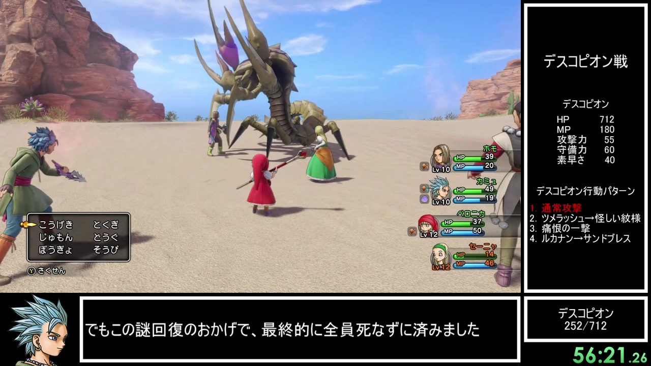 ドラクエ11の3Dモード固定のRTA<br>計測区間は「冒険の書をつくる」から「やっつけた!」の表示まで<br>バグの使用はこのカテゴリでは禁止<br>ネタバレありです、悪しからず<br><br>エイプリルフールネタなんてないよ<br>追記、次回の投稿ですが遅くなります<br><br>part1→<a href="https://www.nicovideo.jp/watch/sm38483514" class="watch">sm38483514</a><br>次→シリーズからよろしく、概要欄の一番下にあるよ<br>これのマイリス→<a href="https://www.nicovideo.jp/mylist/70764070" target="_blank" rel="noopener">mylist/70764070</a><br>無編集垂れ流し→<a href="https://youtu.be/d02n0IpTb10" target="_blank" rel="noopener nofollow">https://youtu.be/d02n0IpTb10</a><br>うp動画まとめ→<a href="https://www.nicovideo.jp/mylist/71230916" target="_blank" rel="noopener">mylist/71230916</a><br><br>デルカダール神殿~デスコピオンまで<br><br>※この動画の一部または全部を外部サイト等へ転載することを禁じます。<br> 動画紹介等で動画の一部を引用するのは構いません。<br><br>唯桜兄貴、派遣のおじ兄貴、さいたまっは兄貴、オルゴ・デミーラ兄貴、yakata兄貴、JJ10兄貴、大工兄貴、グ ラ ス 最 強兄貴、りんご兄貴、2Pカラー兄貴、邪淫の子兄貴、kiton4兄貴、しらえもん兄貴、wata兄貴、pongiku兄貴、ジオ兄貴、ガンドラ兄貴、白犬兄貴、かなぎ兄貴、mawasi兄貴、トロル兄貴、kjirou兄貴、無能兄貴、アラカわ兄貴、C8兄貴、さいおや兄貴、ふみ兄貴、AAA兄貴、foobar兄貴、mako兄貴、AJKK兄貴、GGG兄貴、<a href="https://www.nicovideo.jp/watch/cd4" class="watch">cd4</a>兄貴、天纏兄貴、TOSH13兄貴、産地直送おこめ券兄貴、あおきあおい兄貴、バイドバーガー人口惑星エデン支店兄貴、ねむりねこ兄貴、明田蒼憲兄貴、るい~じ兄貴、ジョルジュ早乙女兄貴 広告ありがとうございます!<br><br>この動画で利用している株式会社スクウェア・エニックスを代表とする共同著作者が権利を所有する著作物及びスギヤマ工房有限会社が権利を所有する楽曲の転載・配布は禁止いたします。<br>(C) ARMOR PROJECT/BIRD STUDIO/SQUARE ENIX All Rights Reserved.<br>(C) SUGIYAMA KOBO (P) SUGIYAMA KOBO