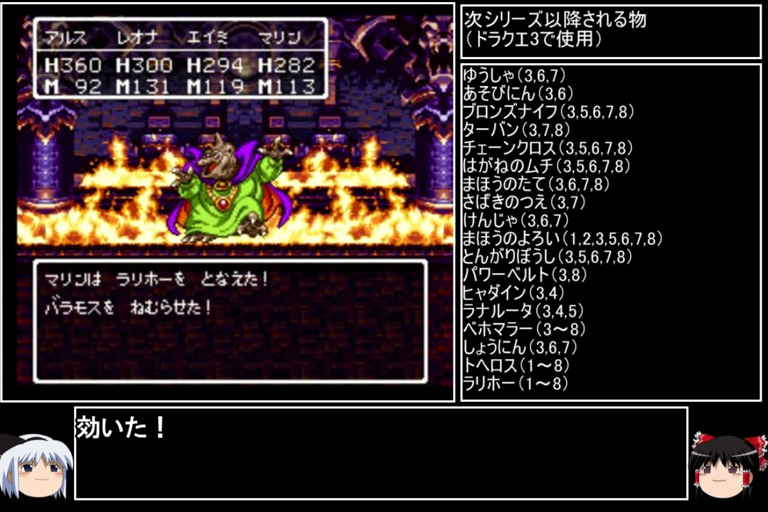 他の方の動画に比べると淡々と縛り攻略していて、<br>派手な演出とかない編集で本当に申し訳ないなと思いました。<br>(※動画の最後のリストにいのりのゆびわを入れ忘れて、もっと申し訳ないなと思いました!)<br><br>前→<a href="https://www.nicovideo.jp/watch/sm38524384" class="watch">sm38524384</a> 次→<a href="https://www.nicovideo.jp/watch/sm38588478" class="watch">sm38588478</a><br><br>YouTube版→<a href="https://www.youtube.com/watch?v=y09oMElLb2g&t=2s" target="_blank" rel="noopener nofollow">https://www.youtube.com/watch?v=y09oMElLb2g&t=2s</a><br><br><br>※動画の大きさが変わる方は、お手数ですが設定→画質を自動から〇pに変えると解決します。<br>※一部機種は互換機を使用してのプレイとなります。<br><br>縛りルール(不明点はシリーズのQ&Aを参照)<br>①使った武器・防具・装飾品・道具・呪文・特技・一部特殊施設(メダル王・カジノ・移民の町)・職業(3,6,7)・仲間モンスター(4,5,6,8+7の職業)は次以降のシリーズで使用禁止。<br>(NPCキャラが使用した装備や呪文を含む。売却及び錬金素材としても使用扱い)<br><br>②裏技・バグ技の禁止。<br><br>③逃走禁止&戦闘終了時は全員生存。<br><br>④レベルを上げ過ぎない。<br>ダンジョンやボスは公式ガイドブックに記載されたレベル+3まで。<br>ラスボスは全ての呪文を習得するレベル+3程度までに収める。<br><br>⑤裏ボスも規定回数、規定ターン以内に倒す。<br>(6の裏ダンジョン突入時のみ、条件を満たすため①の職業を解禁)<br><br>(おまけ)<br>宝は可能なものに限り全回収。<br>5と6は同一モンスターの仲間不可。<br>回避可能なボスも全て倒す。<br><br><br>この動画で利用している株式会社スクウェア・エニックスを代表とする共同著作者が権利を所有する著作物及びスギヤマ工房有限会社が権利を所有する楽曲の転載・配布は禁止いたします。<br>(C) ARMOR PROJECT/BIRD STUDIO/SQUARE ENIX All Rights Reserved.<br>(C) SUGIYAMA KOBO (P) SUGIYAMA KOBO<br><br>AquesTalk2ライセンスID:AQTK2WINUSR23122185<br /><br><br>❤いいねを押していただけるとモチベーションと投稿速度が上がるので宜しくお願い致します!<br><br>作者ツイッター→ <a href="https://twitter.com/nig0117" target="_blank" rel="noopener nofollow">https://twitter.com/nig0117</a><br>PIXIV FANBOX→ <a href="https://sutanokeiji.fanbox.cc/" target="_blank" rel="noopener nofollow">https://sutanokeiji.fanbox.cc/</a><br><br>( 以前はWEB小説書いてました→ <a href="https://kakuyomu.jp/works/1177354054884910267" target="_blank" rel="noopener nofollow">https://kakuyomu.jp/works/1177354054884910267</a> )