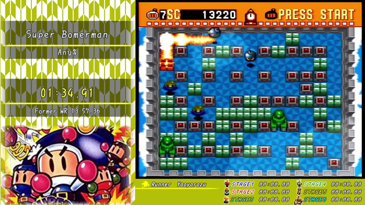 全盛期のスパボン1伝説<br>●6面ボス到達時で30分、コントローラー紛失の状況から一人で13分台を出す<br>●スーファミをつけない日でも世界5位くらいの記録を出す<br>●爆発でハリケーン(火災旋風)が起きたことは有名<br>●スーパーカセットのコントローラーで連続世界3位記録を出したこともある<br>●1面でミスしたように見えたが、実は残像で本体はすでにクリアしていた<br>●テスト配信枠と銘打って2時間走ったら世界一位記録を塗り替えた<br><br>最後以外は嘘です。<br><br>録画ミスで生放送の読み上げが入っちゃってます。ごめんなサイゼリヤ<br>アーカイブ→<a href="https://www.youtube.com/watch?v=tRzq1I_o814&t=2s" target="_blank" rel="noopener nofollow">https://www.youtube.com/watch?v=tRzq1I_o814&t=2s</a><br><br><span style="color: #ff0000;">Youtubeチャンネル開設しました!基本的には生放送のアーカイブ置き場です。</span><br><a href="https://www.youtube.com/channel/UCPUsX1jLhCUuyNqfWgYdH0w" target="_blank" rel="noopener nofollow">https://www.youtube.com/channel/UCPUsX1jLhCUuyNqfWgYdH0w</a><br><br>ボンバーマンRTA → <a href="https://www.nicovideo.jp/mylist/59356396" target="_blank" rel="noopener">mylist/59356396</a><br>その他投稿シリーズPart1まとめ → <a href="https://www.nicovideo.jp/mylist/66405907" target="_blank" rel="noopener">mylist/66405907</a><br><br>Twitter → <a href="https://twitter.com/YaoYorozu_8mi" target="_blank" rel="noopener nofollow">https://twitter.com/YaoYorozu_8mi</a><br>コミュニティ → co3843553