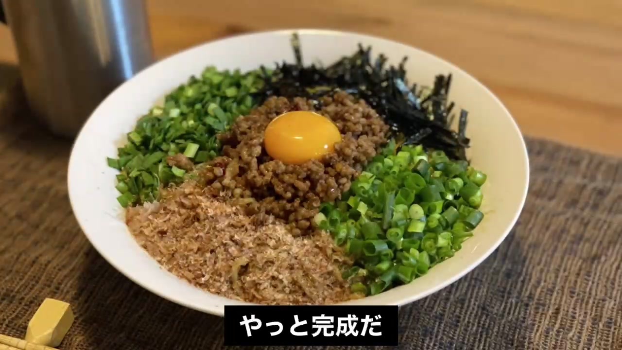 【材料】<br>袋麺 1袋<br><br>トッピング<br>・ネギ 1/4本<br>・ニラ 1/4本<br>・鰹節 1つかみ<br>・焼きのり 適量<br>・生卵 1個<br><br>肉みそ<br>・豚ひき肉 200g<br>・ニンニク 2片<br>・醤油 小さじ1<br>・みりん 小さじ1<br>・料理酒 小さじ1<br>・オイスターソース 小さじ1<br>・砂糖 大さじ1<br><br>混ぜタレ<br>・めんつゆ 大さじ1<br>・醤油 小さじ1<br>・ごま油 小さじ2<br>・花椒 お好み<br><br>【手順】<br>1.ネギ・ニラは小口切り、にんにくは細かめのみじん切り、鰹節はラップをせずにレンジで500wで2分温め握りつぶし、焼きのりは千切りにする<br><br>2.フライパンにごま油を引いてにんにくのみじん切りを投入。香りが立ってきたら豚ひき肉を入れを火を通す。ひき肉に火が通ったら調味料各種を入れ全体を馴染ませる。<br><br>3.小鍋に水を入れ沸騰させ、丼に熱湯を入れ温めておく。麺はお好みの硬さで茹で、麺上げ直前に丼の熱湯を捨て混ぜタレの調味料を各種入れる。<br><br>4.麺が茹で上がったらタレと絡めトッピングを盛りつけ。生卵の白身は貴重なたんぱく源なので<br>啜り卵黄だけにした生卵を肉みその上に盛りつけ完成。<br><br><br>■レシピ本出しました<br>・Amazon<br><a href="https://www.amazon.co.jp/dp/4046047437" target="_blank" rel="noopener nofollow">https://www.amazon.co.jp/dp/4046047437</a><br><br>■Twitterアカウントあります<br><a href="https://twitter.com/kuntotu" target="_blank" rel="noopener nofollow">https://twitter.com/kuntotu</a><br><br>■Instagramもあります<br><a href="https://www.instagram.com/kuntotu/" target="_blank" rel="noopener nofollow">https://www.instagram.com/kuntotu/</a><br><br>■サブチャンネル作りました<br>とっくんのサブチャンネル<br><a href="https://www.youtube.com/channel/UCsU6..." target="_blank" rel="noopener nofollow">https://www.youtube.com/channel/UCsU6...</a><br><br>■ プレゼント、お手紙などの宛先はこちら<br>(※生物、冷蔵便は受け取りができません)<br>〒150-0031<br>東京都渋谷区桜丘町20-1 渋谷インフォスタワー17階<br>株式会社Kiii「とっくん」宛 <br><br>■お仕事の依頼等<br><a href="https://kiii.co.jp/contact/" target="_blank" rel="noopener nofollow">https://kiii.co.jp/contact/</a><br><br>概要欄をご覧いただきありがとうございます。<br>自分を大蛇丸と信じて止まない一般男性こと、とっくんと申します。<br>ただの一般男性です。色んな声真似をさせていただいてます。<br><br>知ってるネタ、面白かったネタがありましたら是非チャンネル登録の程、よろしくお願い申し上げます。