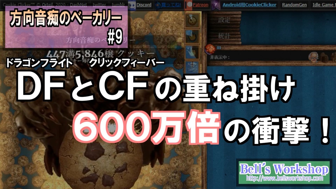 ドラゴンフライトとクリックフィーバーの重ね掛けです。必見です。<br>※4%つってる台詞は7%です。何で間違えたかうp主もわかりません(汗)。<br><br>前:<a href="https://www.nicovideo.jp/watch/sm38567859" class="watch">sm38567859</a> 次:<a href="https://www.nicovideo.jp/watch/sm38611243" class="watch">sm38611243</a> マイリスト:<a href="https://www.nicovideo.jp/mylist/70729379" target="_blank" rel="noopener">mylist/70729379</a><br>※Part9裏話:<a href="http://bellsworkshop.com/cookie-part9/" target="_blank" rel="noopener nofollow">http://bellsworkshop.com/cookie-part9/</a><br><br>ブログ<br><a href="http://www.bellsworkshop.com/" target="_blank" rel="noopener nofollow">http://www.bellsworkshop.com/</a><br><br>Youtubeチャンネル<br><a href="http://www.youtube.com/user/bellsworkshop2" target="_blank" rel="noopener nofollow">http://www.youtube.com/user/bellsworkshop2</a><br><br>Music:purple planet royalty free music <a href="http://www.purple-planet.com/" target="_blank" rel="noopener nofollow">http://www.purple-planet.com/</a><br>Sound:On-Jin ~音人~ <a href="http://on-jin.com/" target="_blank" rel="noopener nofollow">http://on-jin.com/</a><br>