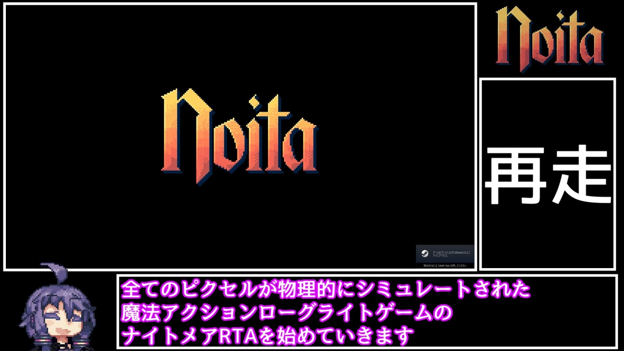 結月ゆかり<br>「ナイトメアでも世界最速でクリアできましたー」<br><br><br>追記<br><br>結月ゆかり<br>「ナイトメアの綴りが間違ってたので修正しました。教えてくれた人ありがとうございます。その他にもたくさんの視聴・広告ありがとうございます。」<br><br>記録が記載されているところ<br><a href="https://www.speedrun.com/noita" target="_blank" rel="noopener nofollow">https://www.speedrun.com/noita</a><br><br>noitaの販売ページ<br><a href="https://store.steampowered.com/app/881100/Noita/?l=japanese" target="_blank" rel="noopener nofollow">https://store.steampowered.com/app/881100/Noita/?l=japanese</a><br><br>通常noitaRTA(世界1位)<br><a href="https://nico.ms/sm38318602" target="_blank" rel="noopener nofollow">https://nico.ms/sm38318602</a><br><br>Overfed (食べ過ぎ)RTA(世界1位)<br><a href="https://nico.ms/sm38415017" target="_blank" rel="noopener nofollow">https://nico.ms/sm38415017</a><br /><br><br><span style="color: #cc0000;">お借りした立ち絵:かれいさん( @flat_fish_ )</span><br><br>
