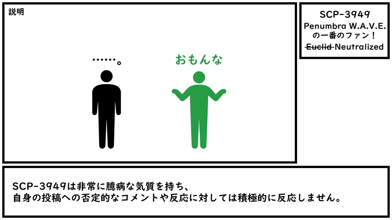 顔も世代も文化的背景もわからない相手に優しくする義務なんて、ネットにはないのさ。<br><br>本家記事 <a href="http://scp-wiki.wikidot.com/scp-3949" target="_blank" rel="noopener nofollow">http://scp-wiki.wikidot.com/scp-3949</a><br>翻訳記事 <a href="http://scp-jp.wikidot.com/scp-3949" target="_blank" rel="noopener nofollow">http://scp-jp.wikidot.com/scp-3949</a><br>作者 Weryllium<br>SCP財団 <a href="http://scp-jp.wikidot.com" target="_blank" rel="noopener nofollow">http://scp-jp.wikidot.com</a><br>過去の動画はこちら <a href="https://www.nicovideo.jp/mylist/67620202" target="_blank" rel="noopener">mylist/67620202</a><br>CC-BY-SA 3.0<br><br>