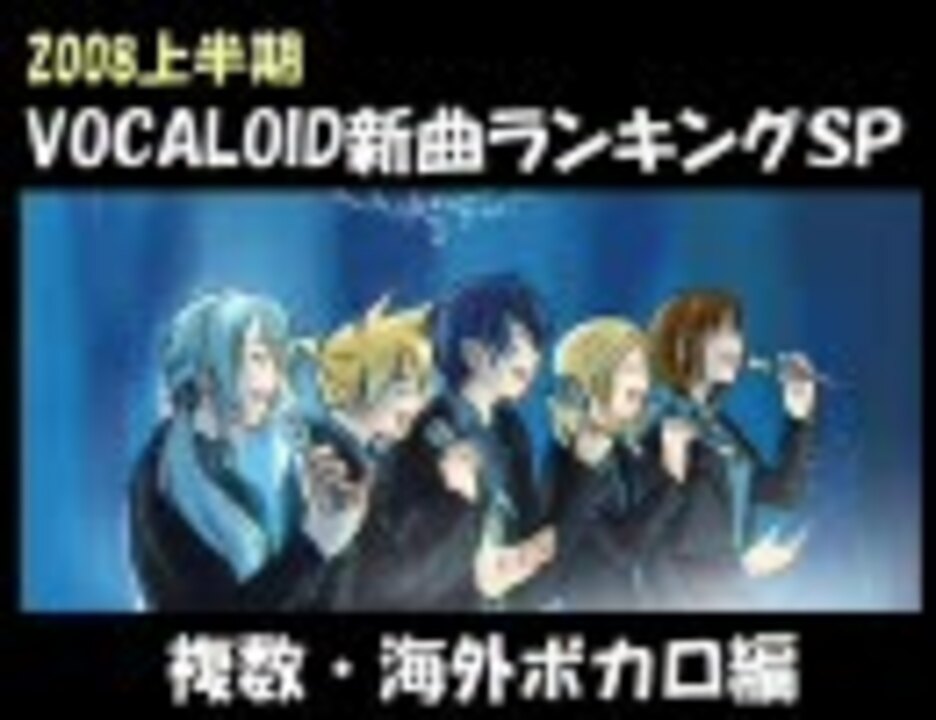 ■集計対象:2007/12/24~2008/6/23投稿の複数ボカロ使用動画<br />■集計方法:2008/7/1 0時のマイリスト数<br />■その他詳細は動画でご確認ください<br />■プレイリスト:<a href="https://www.nicovideo.jp/mylist/7387533" target="_blank" rel="noopener">mylist/7387533</a><br />■新曲SP KAITO編:<a href="https://www.nicovideo.jp/watch/sm3858386" class="watch">sm3858386</a> 鏡音編:<a href="https://www.nicovideo.jp/watch/sm3858389" class="watch">sm3858389</a> MEIKO編:<a href="https://www.nicovideo.jp/watch/sm3860192" class="watch">sm3860192</a><br /> 初音編:<a href="https://www.nicovideo.jp/watch/sm3858391" class="watch">sm3858391</a>/<a href="https://www.nicovideo.jp/watch/sm3858459" class="watch">sm3858459</a> 複数・海外編:<a href="https://www.nicovideo.jp/watch/sm3858440" class="watch">sm3858440</a> PV・MMD編:<a href="https://www.nicovideo.jp/watch/sm3858437" class="watch">sm3858437</a><br />■スクリプトで次の新曲SPに飛びます 次:PV・MMD編<br /><br />※ED曲の投稿日の記載が誤っていました<br />※正しくは「2008年06月22日 05:00:50」投稿です<br /><br />もっと海外組分をお求めの方へ。お待たせしました。<br />海外組Vocaloid新曲ランキングSP (2008上半期版) <a href="https://www.nicovideo.jp/watch/sm3931337" class="watch">sm3931337</a><br />
