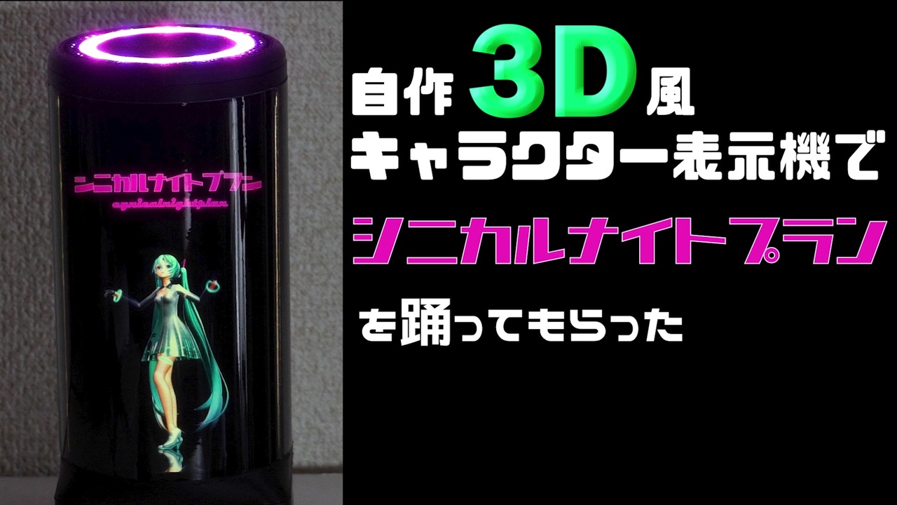 3Dキャラクターがそこにいるように見えるデバイス「CharaPod」を作製したので、Ayaseさん作曲の「シニカルナイトプラン」を初音ミクに踊ってもらいました。<br><span style="color: #ff0000;">デバイスの作成動画をアップしました!</span><br><span style="color: #ff9900;"><strong>3D風キャラクター表示機を作ってみた【CharaPod】:</strong></span><span style="color: #262626;"><strong><a href="https://www.nicovideo.jp/watch/sm38646567" class="watch">sm38646567</a></strong></span><br><span style="color: #ff9900;"><strong>スマホでも3D風キャラクター表示機を作ってみた【CharaPod】:</strong></span><strong><a href="https://www.nicovideo.jp/watch/sm38829721" class="watch">sm38829721</a></strong><br><br>【お借りした素材】<br>楽曲:<a href="https://www.nicovideo.jp/watch/sm36563884" target="_blank" rel="noopener nofollow">https://www.nicovideo.jp/watch/sm36563884</a><br>ダンス:<a href="https://www.nicovideo.jp/watch/sm37092755" target="_blank" rel="noopener nofollow">https://www.nicovideo.jp/watch/sm37092755</a><br>MMDモデル:<a href="https://www.nicovideo.jp/watch/sm31839517" target="_blank" rel="noopener nofollow">https://www.nicovideo.jp/watch/sm31839517</a><br>MMDモーション:<a href="https://www.nicovideo.jp/watch/sm38057511" target="_blank" rel="noopener nofollow">https://www.nicovideo.jp/watch/sm38057511</a><br /><br>今までに作ったもの:<a href="https://www.nicovideo.jp/mylist/34165486" target="_blank" rel="noopener">mylist/34165486</a><br>Twitter(やまたい@ものつくり):<a href="https://twitter.com/yamatai_mk" target="_blank" rel="noopener nofollow">https://twitter.com/yamatai_mk</a><br>ブログ(Prototype 0.9):<a href="https://prototype09.com/" target="_blank" rel="noopener nofollow">https://prototype09.com/</a><br>YouTube:<a href="https://www.youtube.com/channel/UClqT6X996FaRC-kNV1icNpg" target="_blank" rel="noopener nofollow">https://www.youtube.com/channel/UClqT6X996FaRC-kNV1icNpg</a>