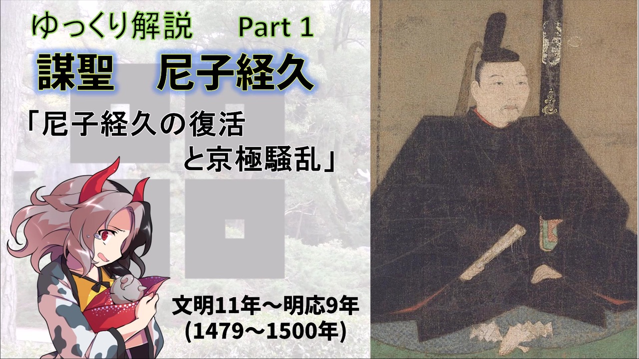<span style="font-size: 24px;">尼子経久の壮絶な人生が今始まる(なお約16年間動向不明)</span><br><br>前回「尼子経久part0」;<a href="https://www.nicovideo.jp/watch/sm38497945" class="watch">sm38497945</a><br>次回「尼子経久part2」;<a href="https://www.nicovideo.jp/watch/sm38667152" class="watch">sm38667152</a><br><br>※今回から12-15分でpartを区切っております<br>初めまして、4月が忙しすぎててんやわんやなしかかくです。<br>part1では、文明16年に起こった尼子経久の追討と、主君である京極家の家督争い・京極騒乱について解説していきます。<br>今回だけで20年近く進みますが、実はこの時期の尼子経久の挙動を示す一次史料は殆ど残っておりません。そのため、近年まで軍記物の内容が無批判で採用されることが多かったですが、近年の研究により大幅な見直しがされています。<br><br><br>YouTube; <a href="https://www.youtube.com/channel/UCRyZjTeQgxd8iXcL2P8vwNA" target="_blank" rel="noopener nofollow">https://www.youtube.com/channel/UCRyZjTeQgxd8iXcL2P8vwNA</a><br>Twitter; <a href="https://twitter.com/SquareDeerHorn" target="_blank" rel="noopener nofollow">https://twitter.com/SquareDeerHorn</a><br><br><br>参考文献<br>藤井崇 『大内義興 : 西国の「覇者」の誕生』<br>市川裕士編『山陰山名氏』<br>長谷川博史『大内氏の興亡と西日本社会』<br>山本浩樹 『西国の戦国合戦』<br>佐伯徳哉 『出雲の中世: 地域と国家のはざま』<br>岸田裕之 『毛利元就~武威天下無双、下民憐愍の文徳は未だ』<br>河村昭一 『安芸武田氏』<br>河合正治 『安芸毛利一族』<br>米原正義 『出雲尼子一族』<br>岸田裕之 「大名領国の構成的展開」<br>長谷川博史「大永七年備後国和智郷細沢山合戦と陣城遺構」<br>長谷川博史「戦国大名尼子氏権力の形成 - 出雲国奉公衆塩冶氏の掌握と討滅」<br>松浦義則 「戦国大名の領主層掌握についてー出雲尼子氏を例として」<br>今岡典和 「戦国期の守護権カ - 出雲尼子氏を素材として」<br>川岡勉 「尼子氏による出雲国成敗権掌握」<br>原慶三 「応仁・文明の乱と尼子氏 : 文書の声を聴く」<br>岡村吉彦 「総論-戦国時代の伯耆地域における戦乱史」<br>今谷明 「『東山殿時代大名外様附』について」<br>羽田聡 「足利義材の西国廻りと吉見氏ー一通の連署状からー」<br><br>