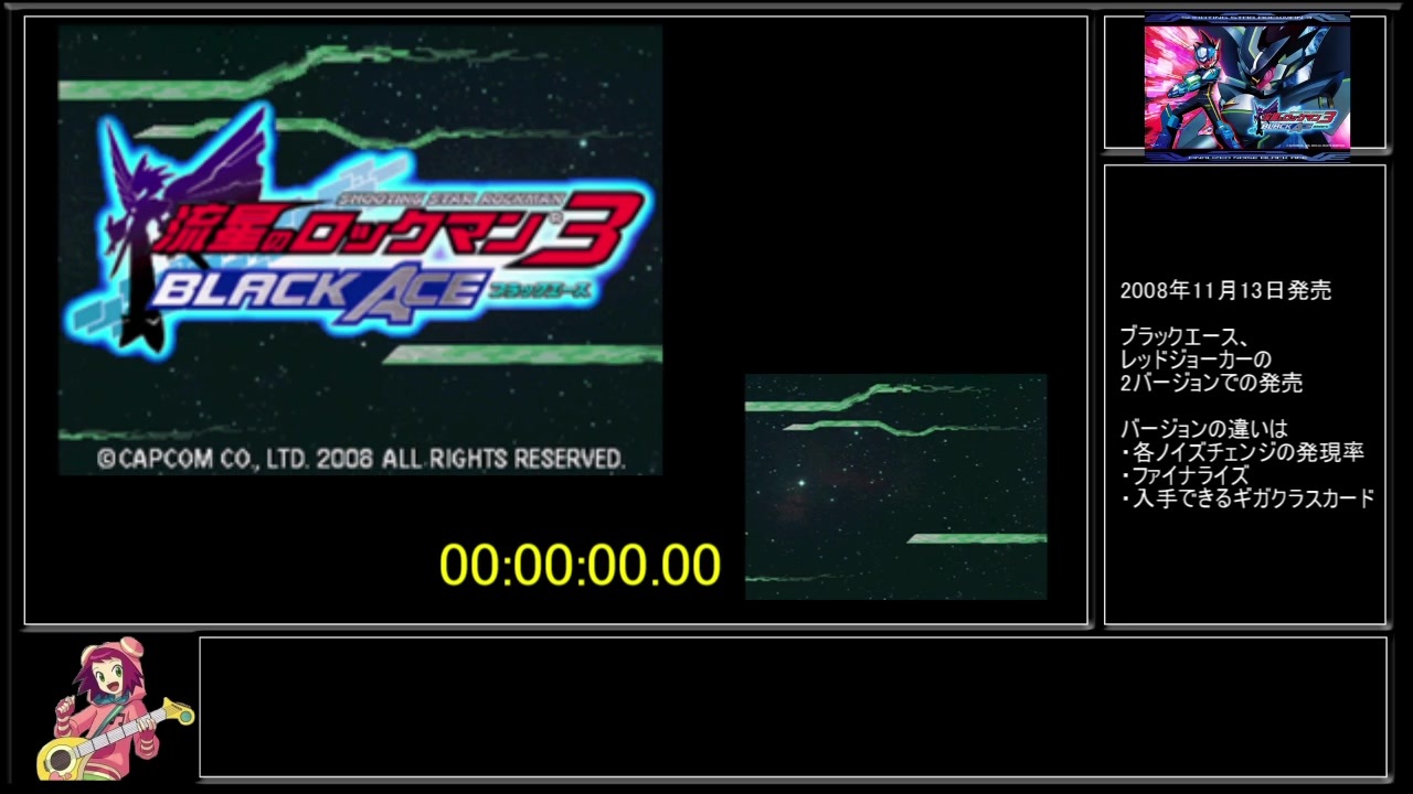初投稿です<br>世界記録を出せたため投稿することにしました<br>よろしくお願いします<br><br>計測開始地点:「はじめから」を選択したタイミング<br>計測終了地点:ラスボス撃破の瞬間<br>※speedrun.com準拠<br><br>■いただいたコメントについて<br>Q:最初の磁力変換パネルに乗るのは間に合わないからですか?<br>A:コメント頂いた通り間に合わないからです<br><br>C:せっかくだから右枠も使ってほしい、チャートがデッキがみたい<br>A:part2以降は右枠に動画に合わせてチャートを入れました<br><br>C:ノイズドカードのどのあたりを入力するかの動画が見たい<br>A:コメント頂いたので作成します<br>どこかのおまけパートにいれるか別動画として作成するかは検討します<br>→<a href="https://www.nicovideo.jp/watch/sm38924198" class="watch">sm38924198</a> (6/22 追記)<br><br>次→<a href="https://www.nicovideo.jp/watch/sm38618839" class="watch">sm38618839</a><br>マイリスト→<a href="https://www.nicovideo.jp/mylist/70893802" target="_blank" rel="noopener">mylist/70893802</a><br><br>流星2 RTA→<a href="https://www.nicovideo.jp/mylist/71292369" target="_blank" rel="noopener">mylist/71292369</a><br><br>普段はTwitchでRTAをしています<br>こちらも見ていただけると嬉しいです<br>→<a href="https://www.twitch.tv/salty0717" target="_blank" rel="noopener nofollow">https://www.twitch.tv/salty0717</a><br><br>twitter→<a href="https://twitter.com/salty0717" target="_blank" rel="noopener nofollow">https://twitter.com/salty0717</a>