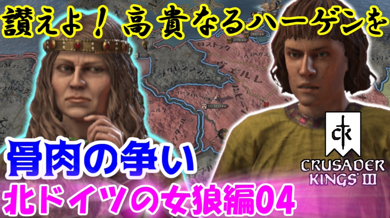 スラヴ人に聖戦を挑み、一気に領土を拡大させていくヘートヴィヒ。<br>ポメラニア国王を名乗ることができるほど拡大した矢先、足元をすくわれることとなった。<br>(今回の動画のタイムライン:1085年6月17日~1090年12月17日)<br><br>この動画はCK3のプレイを基にしたフィクションです。原作(史実)とキャラが違うことがままあります。<br><br>投稿が遅れたのはだいたいウマ娘のせいw<br><br><strong>いつも多額の広告をして頂き、ありがとうございます。</strong><br><span style="color: #ff0000;"><strong>このゲームの詳しい遊び方を知りたい人は:</strong></span><br>ぽりぽりさん:<a href="https://www.nicovideo.jp/watch/sm37478750" class="watch">sm37478750</a><br>ゆらんこさん:<a href="https://www.nicovideo.jp/watch/sm38162125" class="watch">sm38162125</a><br>つー助教授:<a href="https://www.nicovideo.jp/watch/sm38508368" class="watch">sm38508368</a><br><br>ガチ保守の人のゲーム実況1話リンク:<a href="https://www.nicovideo.jp/mylist/53413022" target="_blank" rel="noopener">mylist/53413022</a> <br>前:<a href="https://www.nicovideo.jp/watch/sm38344825" class="watch">sm38344825</a> <a href="https://www.nicovideo.jp/mylist/70176653" target="_blank" rel="noopener">mylist/70176653</a> 次:<a href="https://www.nicovideo.jp/watch/sm38811596" class="watch">sm38811596</a><br>讃えよ!高貴なるハーゲンを!シリーズリスト:<a href="https://www.nicovideo.jp/series/185762" target="_blank" rel="noopener">series/185762</a><br><br>【状況説明】<br>ゲーム開始年月日:1066年9月15日<br>プレイ国家:神聖ローマ帝国諸侯アングリア公爵領内のゲッティンゲン伯爵<br><br>導入DLC<br>主要DLCすべて<br><br>導入MOD<br>Japanese Language Mod<br>Japanese Font Alternative<br>Fullscreen Barbershop<br><br>日本語MODは <a href="https://paradoxian-japan-mod.com/" target="_blank" rel="noopener nofollow">https://paradoxian-japan-mod.com/</a><br>のものを使わせていただいております。<br><br>次回予告曲:【無料フリーBGM】中世の切ない古楽・オーケストラ・ハープ「Minstrel2」<br><a href="https://youtu.be/FLCe8BZRIOM" target="_blank" rel="noopener nofollow">https://youtu.be/FLCe8BZRIOM</a><br><br>進捗はバカッターにてお知らせしています:<a href="https://twitter.com/Kagami_Shusetsu" target="_blank" rel="noopener nofollow">https://twitter.com/Kagami_Shusetsu</a>