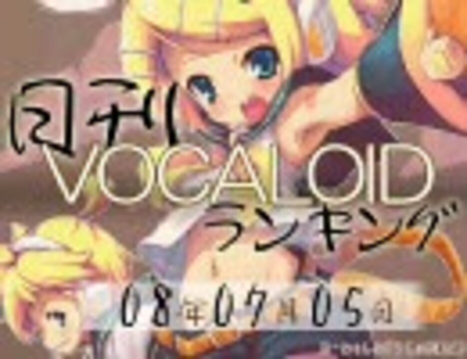 ・集計期間:~7月5日18時<br />・集計方法:再生数+コメント数×補正値+マイリスト数×20<br />・集計対象:投稿日が1週間以内<br />過去にランクインした動画は1位を除き対象外(例外あり)<br />詳しくは↓参照<br /><br />集計、動画作成: rankingloid <a href="http://www.daily-vocaran.info" target="_blank" rel="noopener nofollow">http://www.daily-vocaran.info</a><br />デザイン: 小松菜屋 <a href="http://komatsuna-ya.com/" target="_blank" rel="noopener nofollow">http://komatsuna-ya.com/</a><br /><br />今日はメンテがありました(6時間)<br /><br /><b>2008上半期新曲SP</b> <a href="https://www.nicovideo.jp/watch/sm3858437" class="watch">sm3858437</a><br /><br />8 <a href="https://www.nicovideo.jp/watch/sm3800528" class="watch">sm3800528</a> 7 <a href="https://www.nicovideo.jp/watch/nm3804314" class="watch">nm3804314</a> 6 <a href="https://www.nicovideo.jp/watch/sm3814954" class="watch">sm3814954</a> 5 <a href="https://www.nicovideo.jp/watch/sm3814820" class="watch">sm3814820</a> <br />4 <a href="https://www.nicovideo.jp/watch/nm3842285" class="watch">nm3842285</a> 3 <a href="https://www.nicovideo.jp/watch/sm3848564" class="watch">sm3848564</a> 2 <a href="https://www.nicovideo.jp/watch/sm3840990" class="watch">sm3840990</a> 1 <a href="https://www.nicovideo.jp/watch/sm3846872" class="watch">sm3846872</a> <br />a <a href="https://www.nicovideo.jp/watch/nm3835714" class="watch">nm3835714</a> b <a href="https://www.nicovideo.jp/watch/sm3836154" class="watch">sm3836154</a> c <a href="https://www.nicovideo.jp/watch/sm3840528" class="watch">sm3840528</a> d <a href="https://www.nicovideo.jp/watch/sm3840449" class="watch">sm3840449</a> e <a href="https://www.nicovideo.jp/watch/sm3840142" class="watch">sm3840142</a> <br /><br />日刊最新<a href="https://www.nicovideo.jp/mylist/5024496" target="_blank" rel="noopener">mylist/5024496</a> 全部<a href="https://www.nicovideo.jp/mylist/14671336" target="_blank" rel="noopener">mylist/14671336</a><br />7/4 <a href="https://www.nicovideo.jp/watch/sm3853297" class="watch">sm3853297</a> 7/6 <a href="https://www.nicovideo.jp/watch/sm3876743" class="watch">sm3876743</a>