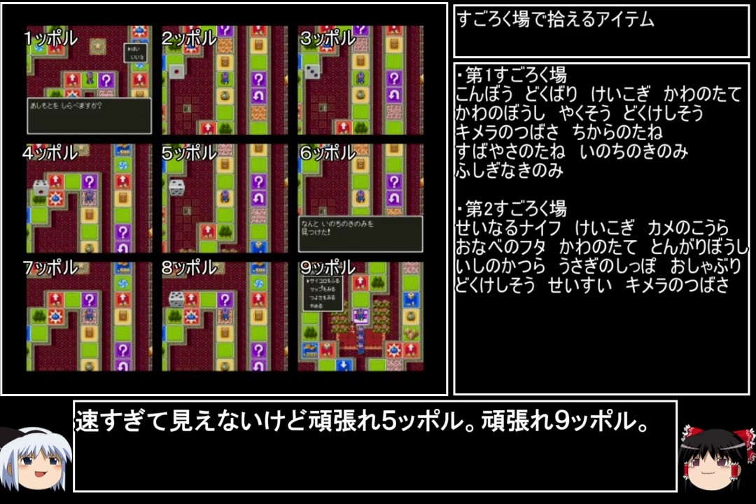 初めての4分割はふくびきでしたが、9分割がすごろくになるとは思わなかった……。<br>16分割する日が来るとしたら、どこになるんだろう?<br><br>前→<a href="https://www.nicovideo.jp/watch/sm38624114" class="watch">sm38624114</a> 次→<a href="https://www.nicovideo.jp/watch/sm38667655" class="watch">sm38667655</a><br><br>YouTube版→<a href="https://www.youtube.com/watch?v=dc9vNU_jnUc&t=4s" target="_blank" rel="noopener nofollow">https://www.youtube.com/watch?v=dc9vNU_jnUc&t=4s</a><br><br><br>※動画の大きさが変わる方は、お手数ですが設定→画質を自動から〇pに変えると解決します。<br>※一部機種は互換機を使用してのプレイとなります。<br><br>縛りルール(不明点はシリーズのQ&Aを参照)<br>①使った武器・防具・装飾品・道具・呪文・特技・一部特殊施設(メダル王・カジノ・移民の町)・職業(3,6,7)・仲間モンスター(4,5,6,8+7の職業)は次以降のシリーズで使用禁止。<br>(NPCキャラが使用した装備や呪文を含む。売却及び錬金素材としても使用扱い)<br><br>②裏技・バグ技の禁止。<br><br>③逃走禁止&戦闘終了時は全員生存。<br><br>④レベルを上げ過ぎない。<br>ダンジョンやボスは公式ガイドブックに記載されたレベル+3まで。<br>ラスボスは全ての呪文を習得するレベル+3程度までに収める。<br><br>⑤裏ボスも規定回数、規定ターン以内に倒す。<br>(6の裏ダンジョン突入時のみ、条件を満たすため①の職業を解禁)<br><br>(おまけ)<br>宝は可能なものに限り全回収。<br>5と6は同一モンスターの仲間不可。<br>回避可能なボスも全て倒す。<br><br><br>この動画で利用している株式会社スクウェア・エニックスを代表とする共同著作者が権利を所有する著作物及びスギヤマ工房有限会社が権利を所有する楽曲の転載・配布は禁止いたします。<br>(C) ARMOR PROJECT/BIRD STUDIO/SQUARE ENIX All Rights Reserved.<br>(C) SUGIYAMA KOBO (P) SUGIYAMA KOBO<br><br>AquesTalk2ライセンスID:AQTK2WINUSR23122185<br /><br><br>❤いいねを押していただけるとモチベーションと投稿速度が上がるので宜しくお願い致します!<br><br>作者ツイッター→ <a href="https://twitter.com/nig0117" target="_blank" rel="noopener nofollow">https://twitter.com/nig0117</a><br>PIXIV FANBOX→ <a href="https://sutanokeiji.fanbox.cc/" target="_blank" rel="noopener nofollow">https://sutanokeiji.fanbox.cc/</a><br><br>( 以前はWEB小説書いてました→ <a href="https://kakuyomu.jp/works/1177354054884910267" target="_blank" rel="noopener nofollow">https://kakuyomu.jp/works/1177354054884910267</a> )