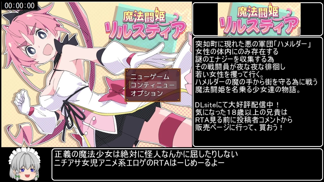 ニチアサ系は初投稿です。よろしくお願いします。<br><br>【ShiBoo! 】様制作のR-18RPG<br>【魔法闘姫リルスティア】グッドエンドRTAです。<br>計測開始:ニューゲーム選択<br>計測終了:スタッフロールが流れ始めた瞬間<br><br><br>[追記]沢山の広告ありがとうございます!<br>励みになります!<br>作者様から反応頂きまして恐縮です!ありがとうございます!<br><br>そしてお詫びを一つ<br>最後の方学生証摘み上げを云々言ってますが、主人公の学生バレは<br>また別の理由でした。誤情報流して申し訳ないです!<br>でもすごく可哀そうで可愛くてエロいのは確かなので<br>みんな是非買ってプレイして確かめてみてくださいね!<br><br>次→<a href="https://www.nicovideo.jp/watch/sm38663605" class="watch">sm38663605</a><br><br>魔法闘姫シリーズRTAのマイリスト→<a href="https://www.nicovideo.jp/mylist/70963331" target="_blank" rel="noopener">mylist/70963331</a><br><br>パート1と単発のマイリスト→<a href="https://www.nicovideo.jp/mylist/70659794" target="_blank" rel="noopener">mylist/70659794</a><br><br>魔法闘姫フロスティアRTA→<a href="https://www.nicovideo.jp/watch/sm39723537" class="watch">sm39723537</a><br><br>twitter:@hihidowser<br><br>スマホやタブレット等から見られない方はこちらの方の動画を参考にすると<br>見られるようになるはずです→ <a href="https://www.nicovideo.jp/watch/sm38575952" class="watch">sm38575952</a><br><br>本作品の購入は下記サイトにて!<br>DLsite(PC)<br><br>HBOX(スマホ)<br>