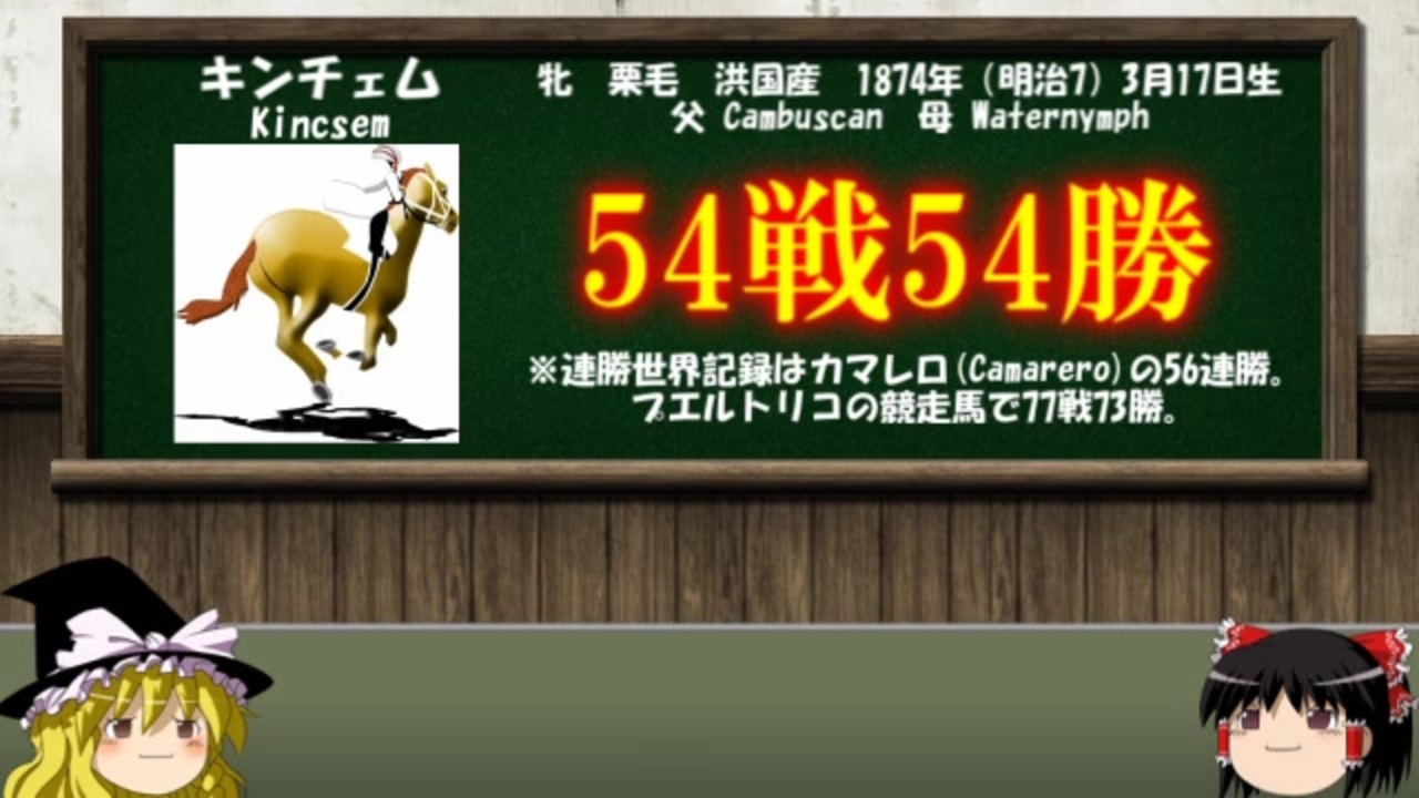 前作<a href="https://www.nicovideo.jp/watch/sm37888630" class="watch">sm37888630</a> 次作<a href="https://www.nicovideo.jp/watch/sm39156173" class="watch">sm39156173</a> 牝馬シリーズマイリス<a href="https://www.nicovideo.jp/mylist/65869255" target="_blank" rel="noopener">mylist/65869255</a> 競馬解説マイリス<a href="https://www.nicovideo.jp/mylist/64207040" target="_blank" rel="noopener">mylist/64207040</a> <br><br>つべ<a href="https://youtu.be/RR6gMw62GEU" target="_blank" rel="noopener nofollow">https://youtu.be/RR6gMw62GEU</a><br><br>名馬解説第10弾、キンチェムです。<br>54戦54勝。ハンガリーの奇跡と呼ばれた世界的歴史的名馬を紹介します。<br>ウマ娘流行ってますねぇ。<br><br>BGM:甘茶の音楽工房様<br>画像提供元: TURF☆DUST 様 うまぽっと様 いらすとや様 きつねゆっくり様<br>参考HP:優駿達の蹄跡様 netkeiba.com Wikipedia JRA JBISサーチ ニコニコ大百科(仮)