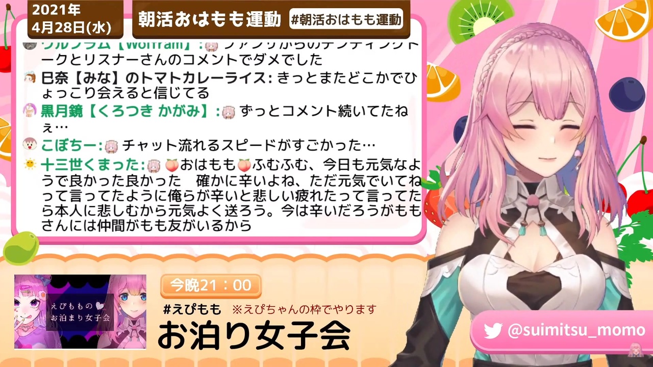4/27の卒業配信を一緒に見ていてくれたももちゃん<br>「笑ってお疲れ様です。おめでとうございます。」って言うつもりだったけど<br>ファンサで崩壊して号泣してしまったことを語ってくれました<br><br>チャット欄の暖かさや終わった後のハッシュタグを見て<br>みんなに元気をあげられる存在、卒業する時に沢山の人が惜しんでくれる存在<br>そんな風に頑張ってなりたいって言ってくれました<br><br>ありがとう<br>想い出として誰かが語ってくれる限り<br>彼女はみんなの中から消えたりしないと思います<br><br>※ほぼ毎朝朝からコメント読んでおはよう活動しています<br> 食べるの大好きで料理もお菓子も自分で作ってもりもり食べる彼女<br> 用意した食べ物が配信中にけっこうなくなってます( *´艸`)<br><span style="font-size: 14px;"> 関西弁が特徴の明るく笑いが絶えない配信です</span><br><br>元動画:2021-04-28<br>【プチ雑談】4/28 おはももしてくれた人のお名前絶対読むマンの朝活おはもも運動!!<br><a href="https://www.youtube.com/watch?v=a2X7ZWuM2H4&t=252s" target="_blank" rel="noopener nofollow">https://www.youtube.com/watch?v=a2X7ZWuM2H4&t=252s</a>
