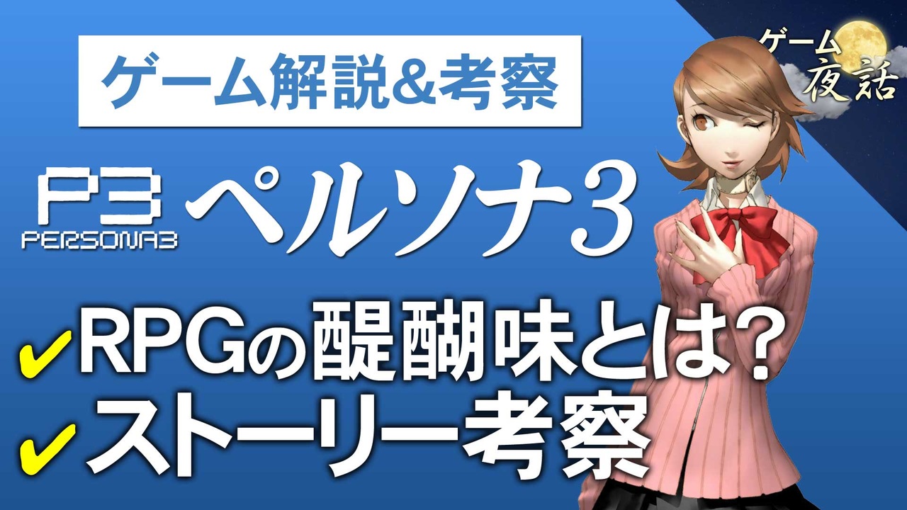 過去動画を宣伝して下さった皆さん、ありがとうございましたm(__)m<br>毎回ひとつのゲームを取り上げ、3つのテーマから解説&考察します。<br>【前編】は毎月1日・15日更新、【後編】は制作状況に応じて更新致します。<br><br>■第97回「ペルソナ3」<br>前編:<a href="https://www.nicovideo.jp/watch/sm38585959" class="watch">sm38585959</a><br><br>■youtubeはこちら <a href="https://youtu.be/IJA8CM7BGWU" target="_blank" rel="noopener nofollow">https://youtu.be/IJA8CM7BGWU</a><br>■ゲーム夜話ツイッター <a href="https://twitter.com/gameyawa" target="_blank" rel="noopener nofollow">https://twitter.com/gameyawa</a><br><br>■第96回「ラスアス2」<br>前編:<a href="https://www.nicovideo.jp/watch/sm38521781" class="watch">sm38521781</a> 後編:<a href="https://www.nicovideo.jp/watch/sm38568452" class="watch">sm38568452</a><br>■第98回「ドラッグオンドラグーン」<br>前編:<a href="https://www.nicovideo.jp/watch/sm38684477" class="watch">sm38684477</a> 後編:※ただいま作成中ですm(__)m<br><br>■ゲーム夜話マイリスト <a href="https://www.nicovideo.jp/mylist/56973971" target="_blank" rel="noopener">mylist/56973971</a><br><br><span style="color: #000000; font-size: 13px;">■ゲームジャンル別マイリスト</span><br>・RPG <a href="https://www.nicovideo.jp/mylist/69852172" target="_blank" rel="noopener">mylist/69852172</a><br>・アクション <a href="https://www.nicovideo.jp/mylist/69852179" target="_blank" rel="noopener">mylist/69852179</a><br>・アクションRPG <a href="https://www.nicovideo.jp/mylist/69852177" target="_blank" rel="noopener">mylist/69852177</a><br>・アドベンチャー <a href="https://www.nicovideo.jp/mylist/69852182" target="_blank" rel="noopener">mylist/69852182</a><br>・アクションアドベンチャー <a href="https://www.nicovideo.jp/mylist/69852188" target="_blank" rel="noopener">mylist/69852188</a><br>・シミュレーション <a href="https://www.nicovideo.jp/mylist/69852189" target="_blank" rel="noopener">mylist/69852189</a><br>・ホラー <a href="https://www.nicovideo.jp/mylist/69852194" target="_blank" rel="noopener">mylist/69852194</a><br>・サウンドノベル <a href="https://www.nicovideo.jp/mylist/69852197" target="_blank" rel="noopener">mylist/69852197</a>