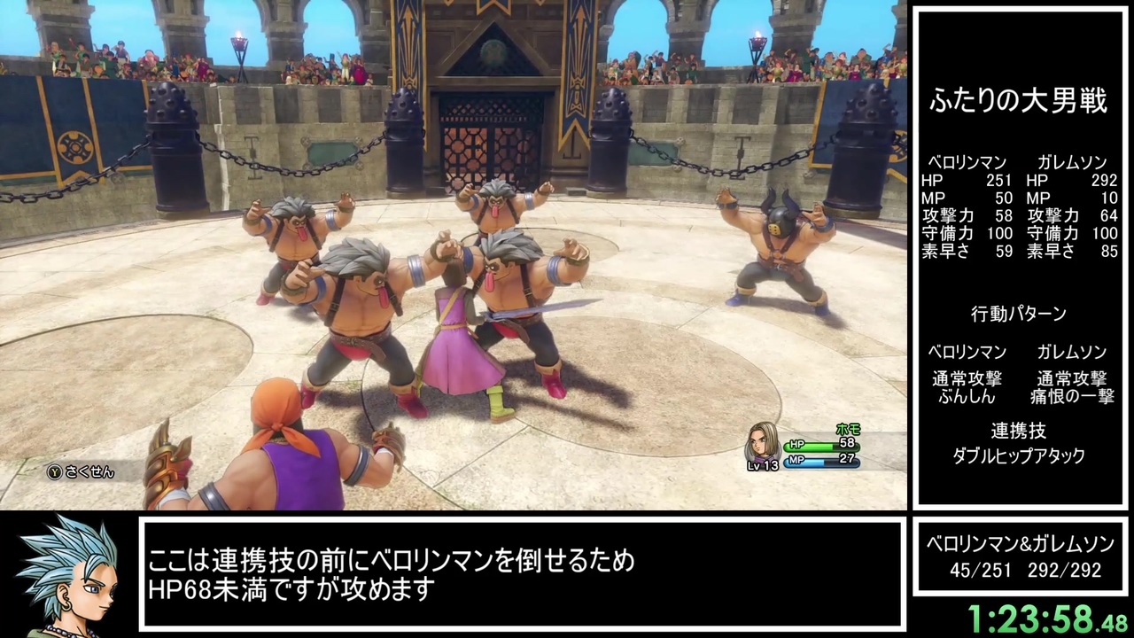 ドラクエ11の3Dモード固定のRTA<br>計測区間は「冒険の書をつくる」から「やっつけた!」の表示まで<br>バグの使用はこのカテゴリでは禁止<br>ネタバレありです、悪しからず<br><br>お久しぶりです、イベランしてました<br><br>part1→<a href="https://www.nicovideo.jp/watch/sm38483514" class="watch">sm38483514</a><br>次→シリーズからよろしく、概要欄の一番下にあるよ<br>これのマイリス→<a href="https://www.nicovideo.jp/mylist/70764070" target="_blank" rel="noopener">mylist/70764070</a><br>無編集垂れ流し→<a href="https://youtu.be/d02n0IpTb10" target="_blank" rel="noopener nofollow">https://youtu.be/d02n0IpTb10</a><br>うp動画まとめ→<a href="https://www.nicovideo.jp/mylist/71230916" target="_blank" rel="noopener">mylist/71230916</a><br><br>デスコピオン撃破後~グロッタ地下遺構まで<br><br>※この動画の一部または全部を外部サイト等へ転載することを禁じます。<br> 動画紹介等で動画の一部を引用するのは構いません。<br><br>唯桜兄貴、C8兄貴、<a href="https://www.nicovideo.jp/watch/cd4" class="watch">cd4</a>兄貴、Cow兄貴、ガンドラ兄貴、せいどん兄貴、グ ラ ス 最 強兄貴、VIC兄貴、JJ10兄貴、skp兄貴、ふぁびっと兄貴、しらえもん兄貴、産地直送おこめ券兄貴、berukusu7402兄貴、yakata兄貴、白犬兄貴、れうすき兄貴、かなぎ兄貴、ゴハン兄貴、無名の名無し兄貴、白乾児兄貴、GGG兄貴、ボーイッシュまみガチ恋勢兄貴、かーくん兄貴、トロル兄貴、wata兄貴、明田蒼憲兄貴、テン兄貴、ジョルジュ早乙女兄貴、みすと兄貴、TOSH13兄貴、mawasi兄貴、バイドバーガー人口惑星エデン支店兄貴、るい~じ兄貴、バズー兄貴 広告ありがとうございます!<br><br>この動画で利用している株式会社スクウェア・エニックスを代表とする共同著作者が権利を所有する著作物及びスギヤマ工房有限会社が権利を所有する楽曲の転載・配布は禁止いたします。<br>(C) ARMOR PROJECT/BIRD STUDIO/SQUARE ENIX All Rights Reserved.<br>(C) SUGIYAMA KOBO (P) SUGIYAMA KOBO