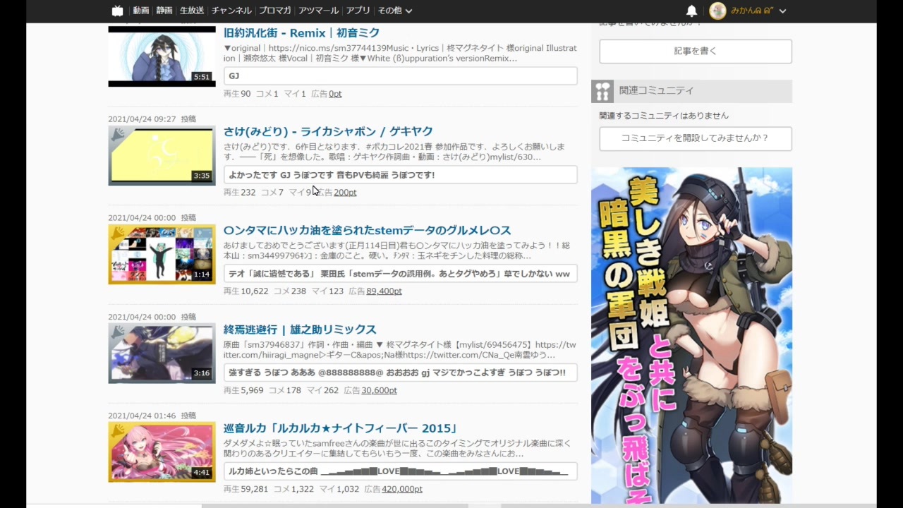 <span style="color: #ff0000; font-size: 18px;"><u>超ニコニコインフォ2021@ニコニコネット超会議2021【4/30】</u></span><br>≪ <a href="https://live.nicovideo.jp/watch/lv331029935" target="_blank" rel="noopener">lv331029935</a> ≫<br>で紹介されました。何故かはわかりません。<span style="color: #0000ff;"><u>(27:20ごろ)</u></span><br><br>流行りの動画からインスピレーションを受けるのは大事だと思います。<br><br>※超ニコニコインフォの二次会、「だるまさんがころんだ」で敗北した結果決定した動画です。<br><br>お借りした動画(申し訳ない)<br>《〇ンタマにハッカ油を塗られたstemデータのグルメレ〇ス/<a href="https://www.nicovideo.jp/watch/sm38622334" class="watch">sm38622334</a>》<br><br>《【ボカロオリジナル曲】45秒【踊ってみた】/<a href="https://www.nicovideo.jp/watch/sm20982791" class="watch">sm20982791</a>》<br><br>前の動画 いないない/<a href="https://www.nicovideo.jp/watch/sm38251665" class="watch">sm38251665</a><br />ご視聴いただきありがとうございます!<br><br>Twitter<br>→<a href="https://twitter.com/K_mikan_nico" target="_blank" rel="noopener nofollow">https://twitter.com/K_mikan_nico</a><br><br>