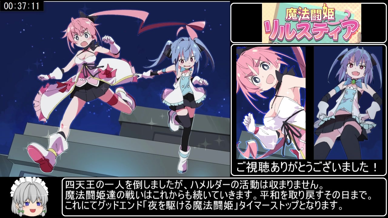 ニチアサ系初投稿のBパートないしは1時間特番のDパートです。よろしくお願いします。<br><br>【ShiBoo! 】様制作のR-18RPG<br>【魔法闘姫リルスティア】グッドエンドRTAです。<br>計測開始:ニューゲーム選択<br>計測終了:スタッフロールが流れ始めた瞬間<br><br>前→<a href="https://www.nicovideo.jp/watch/sm38651351" class="watch">sm38651351</a><br><br>魔法闘姫シリーズRTAのマイリスト→<a href="https://www.nicovideo.jp/mylist/70963331" target="_blank" rel="noopener">mylist/70963331</a><br><br>パート1と単発のマイリスト→<a href="https://www.nicovideo.jp/mylist/70659794" target="_blank" rel="noopener">mylist/70659794</a><br><br>魔法闘姫フロスティアRTA→<a href="https://www.nicovideo.jp/watch/sm39723537" class="watch">sm39723537</a><br><br>twitter:@hihidowser<br><br>スマホやタブレット等から見られない方はこちらの方の動画を参考にすると<br>見られるようになるはずです→ <a href="https://www.nicovideo.jp/watch/sm38575952" class="watch">sm38575952</a><br><br>本作品の購入は下記サイトにて!<br>DLsite(PC)<br><br>HBOX(スマホ)<br>