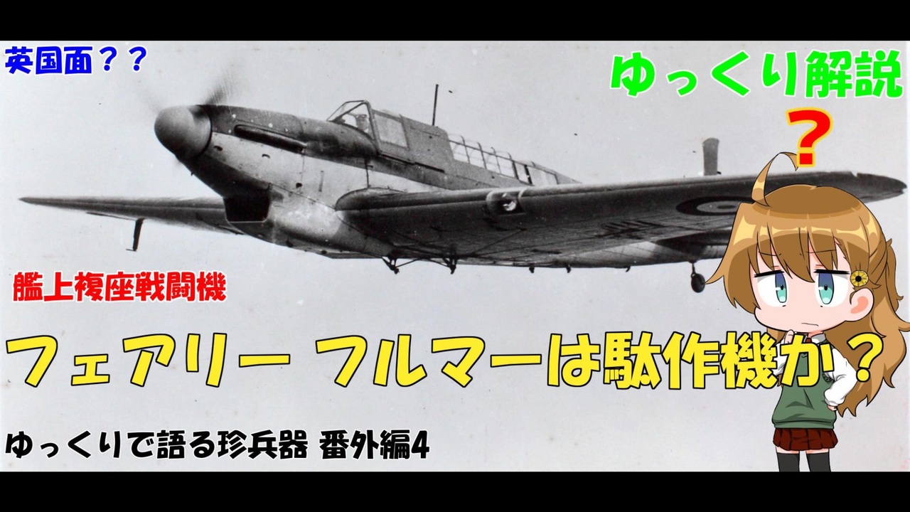 珍しく個人の考察が多めの動画ってことで番外編となります。<br>簡単に言うと「ソードフィッシュは傑作扱いなのにフルマーが駄作扱いなのはなんか違う気がする」って感じの動画<br>ブログ版はこちら→<a href="https://teambtrb.com/?p=1903" target="_blank" rel="noopener nofollow">https://teambtrb.com/?p=1903</a><br><br>・参考文献<br>ブログ版の最後にまとめてあるのでそちらを<br><br>・BGM<br>Pardon The Glove"(いつもの)<br>"Breakaway"(Jack Hylton)<br>"After My Laughter Came Tears"(いつもの)<br><br>グッズ販売やってます→<a href="https://straw2nd.booth.pm/" target="_blank" rel="noopener nofollow">https://straw2nd.booth.pm/</a><br>Twitter→@straw2nd(<a href="https://twitter.com/straw2nd" target="_blank" rel="noopener nofollow">https://twitter.com/straw2nd</a> )<br>絵師様(<a href="https://www.nicovideo.jp/user/18488128" target="_blank" rel="noopener">user/18488128</a>)Twitter→@myonshiso(<a href="https://twitter.com/myonshiso" target="_blank" rel="noopener nofollow">https://twitter.com/myonshiso</a> )<br>お題箱(兵器のリクエストはここへ)→<a href="http://odaibako.net/u/straw2nd" target="_blank" rel="noopener nofollow">http://odaibako.net/u/straw2nd</a><br>サークルHP(ブログでも兵器解説してるよ→<a href="http://teambtrb.com/" target="_blank" rel="noopener nofollow">http://teambtrb.com/</a><br>旧珍兵器リスト(シリーズ)→<a href="https://www.nicovideo.jp/series/40593" target="_blank" rel="noopener">series/40593</a><br>新珍兵器リスト→<a href="https://www.nicovideo.jp/mylist/68497286" target="_blank" rel="noopener">mylist/68497286</a><br>新珍兵器シリーズ→<a href="https://www.nicovideo.jp/series/134646" target="_blank" rel="noopener">series/134646</a><br>まとめ→<a href="https://www.nicovideo.jp/mylist/54248344" target="_blank" rel="noopener">mylist/54248344</a><br>