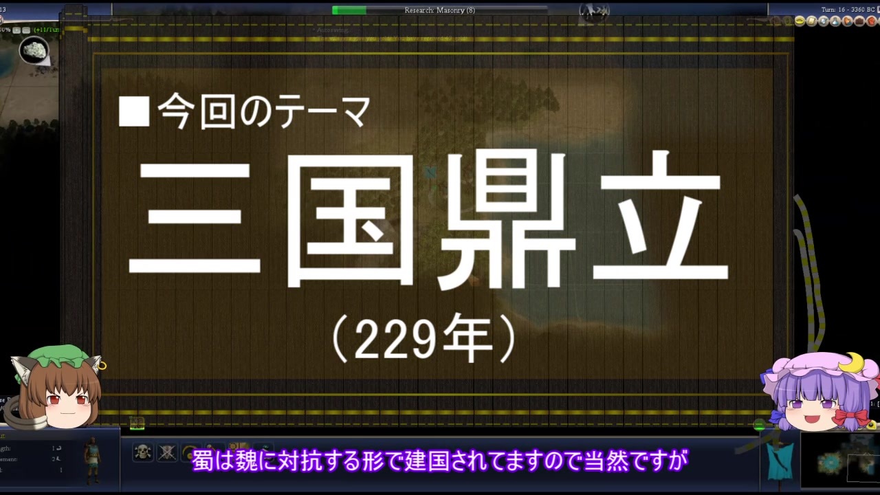 コレで正式に「三国」が出揃いました。<br>今回は総集編気味な内容になってます。<br><br>解説 :パチュリー<br>曹叡 :橙<br>諸葛亮 :映姫<br>孫権 :レミリア<br>曹真 :レティ<br>曹休 :大妖精<br>陸遜 :布都<br>劉禅 :萃香<br>陸遜 :布都<br>司馬懿 :永琳<br>張郃 :慧音<br><br>■次回<br>子午の役前編<br><a href="https://www.nicovideo.jp/watch/sm39047667" class="watch">sm39047667</a><br><br>■前回<br>第三次北伐篇<br><a href="https://www.nicovideo.jp/watch/sm38382044" class="watch">sm38382044</a><br><br>☆参考サイト<br>■三国志、全文検索<br><a href="http://www.seisaku.bz/sangokushi.html" target="_blank" rel="noopener nofollow">http://www.seisaku.bz/sangokushi.html</a><br><br>■三国志総合情報サイト<br><a href="https://sangokushi.jp/" target="_blank" rel="noopener nofollow">https://sangokushi.jp/</a><br><br>■维基文库(資治通鑑)<br><a href="https://zh.wikisource.org/wiki/%E8%B3%87%E6%B2%BB%E9%80%9A%E9%91%91" target="_blank" rel="noopener nofollow">https://zh.wikisource.org/wiki/%E8%B3%87%E6%B2%BB%E9%80%9A%E9%91%91</a><br><br>■BGM<br>砂塵の城塞 秋山 裕和/ H/MIX GALLERY<br><a href="https://www.youtube.com/watch?v=St5xGcm4xl8&t=464s" target="_blank" rel="noopener nofollow">https://www.youtube.com/watch?v=St5xGcm4xl8&t=464s</a><br><br>■背景のゲーム<br>2K Games <br>Civilization IV: Beyond the Sword<br><br>動画作成ツール:ゆっくりムービーメーカー3<br><a href="https://manjubox.net/ymm3/" target="_blank" rel="noopener nofollow">https://manjubox.net/ymm3/</a><br><br>立ち絵:キャラ素材(きつねゆっくり) - Nicotalk &キャラ素材配布所<br><a href="http://www.nicotalk.com/charasozai_kt.html" target="_blank" rel="noopener nofollow">http://www.nicotalk.com/charasozai_kt.html</a><br><br>AquesTalkライセンス購入済み