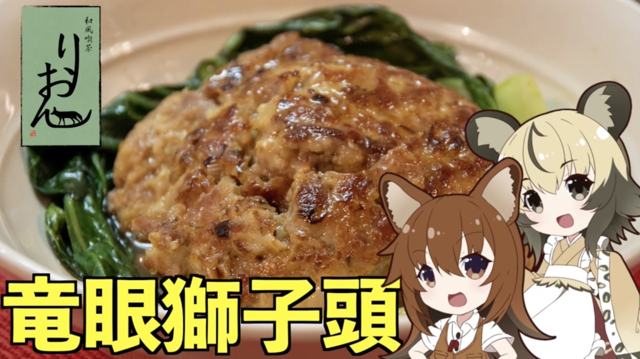 りおんの和風喫茶へようこそ<br><br>今回はりょの字さん(<a href="https://twitter.com/ryonoji2020" target="_blank" rel="noopener nofollow">https://twitter.com/ryonoji2020</a> )主催<br>「N1グランプリ」の創作料理部門に参加します。<br><br>今回作るのは、<br>かっこいい生き物×かっこいい伝説の生き物を掛け合わせた<br>「竜眼獅子頭」です。<br><br>■材料(2人分)<br>・豚肉の切り落とし 300g<br>・長ネギ 1/2本<br>・チンゲンサイ 3〜4枚<br>・卵(2個は茹で卵用)3個<br>・塩 小さじ1<br>・砂糖 大さじ1<br>・胡椒 お好みの量<br>・おろし生姜 大さじ1<br>・ごま油 大さじ1<br>・片栗粉 大さじ1<br>・水 30mL<br><br>タレ<br>・水 100mL<br>・砂糖 お好みの量<br>・中華スープの素 お好みの量<br>・白だし お好みの量<br>・醤油 お好みの量<br><br>■所要時間<br>作業時間:30分程度<br><br>youtube:<a href="https://youtu.be/2a-DAJOWlt8" target="_blank" rel="noopener nofollow">https://youtu.be/2a-DAJOWlt8</a><br />twitter:@lycaon_kitchen<br><br>りおんの和風喫茶:<a href="https://www.nicovideo.jp/series/77190" target="_blank" rel="noopener">series/77190</a><br>おつかれごはん:<a href="https://www.nicovideo.jp/series/155690" target="_blank" rel="noopener">series/155690</a><br>手作り和菓子でちょっとひとやすみしませんか?:<a href="https://www.nicovideo.jp/series/155691" target="_blank" rel="noopener">series/155691</a><br><br><span style="color: rgba(0, 0, 0, 0.87);">立ち絵:</span>星華 彩二魔 様<br><span style="color: rgba(0, 0, 0, 0.87);">イラスト:いらすとや、AWD kitchen<br>音源:DOVA-SYNDROME、ポケットサウンド<br>音声:VOICEROID2 </span>紲星あかり、東北イタコ + exVOICE