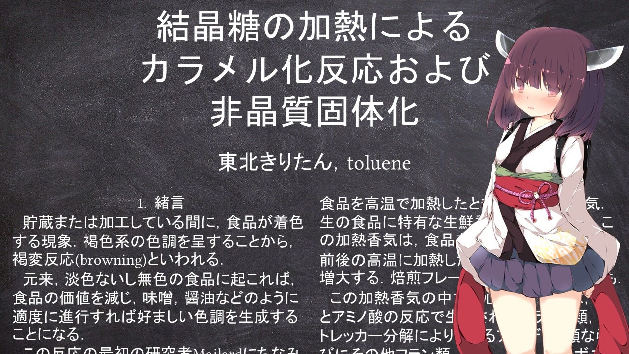 りょの字様主催の<br>「N1グランプリ」に参加させていただきます<br> <br>ええ,はいネタ極振りですとも<br><span style="font-size: 10px;">そして開会式と若干被ったああああああああ!!<br>(そりゃ誰でも考えるよね orz )</span><br><br>悩んだのは“<span style="font-size: 14px;">実在料理部門</span>”か“創作料理部門”か?<br>実在している料理の言い換えはどちら何だろうか・・・<br>とりあえず『創作料理部門』ってことで(悩んだらこっちにしたら間違いないやろ)<br> <br>まあ,レギュ違反失格でも構わない<br>参加することに意義がある<br>動画投稿者なら知名度上げ優先(承認欲求には忠実です)<br><br> <br>投稿者の他の動画<br>化学 <a href="https://www.nicovideo.jp/mylist/70539607" target="_blank" rel="noopener">mylist/70539607</a><br>生化学 <a href="https://www.nicovideo.jp/mylist/70970603" target="_blank" rel="noopener">mylist/70970603</a><br>物理史 <a href="https://www.nicovideo.jp/watch/sm37438860" class="watch">sm37438860</a><br> <br>・参考文献(抜粋)<br>宮澤陽夫,五十嵐脩,“新訂 食品の機能化学”,アイ・ケイ・コーポレーション(2016).<br>玉虫伶太,井上祥平,梅澤喜夫,小谷正博,鈴木紘一,務台潔,“エッセンシャル 化学辞典” ,東京化学同人(1999).<br>・使用ソフト<br>“VOICEROID+ 東北きりたんEX”,株式会社AHS<br>・使用画像<br>たぶちさんち,“東北きりたん立ち絵素材”(<a href="https://seiga.nicovideo.jp/seiga/im7029628)." target="_blank" rel="noopener nofollow">https://seiga.nicovideo.jp/seiga/im7029628).</a><br>Pixabay,<a href="https://pixabay.com/ja/" target="_blank" rel="noopener nofollow">https://pixabay.com/ja/</a><br>・使用音楽<br>“わくわくクッキングタイム的なBGM”(<a href="https://commons.nicovideo.jp/material/nc132272)." target="_blank" rel="noopener nofollow">https://commons.nicovideo.jp/material/nc132272).</a><br>