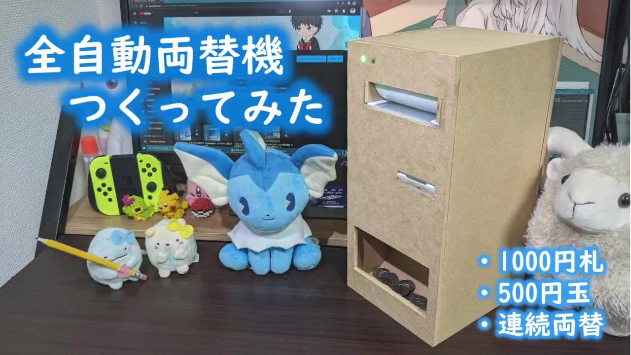 ▼前作「材料費324円で両替機つくってみた」<br><a href="https://www.nicovideo.jp/watch/sm34826223" class="watch">sm34826223</a><br><br>皆さまの温かい応援のおかげで、2年前の宿題を終わらせることができました。<br><br>構想:約2年<br>制作期間:2か月<br>材料費:5000円くらい<br><br>追記:広告ありがとうございます!!<br>追記2:前の動画を覚えている人がたくさんいて嬉しいです! 就職のお祝いもありがとう! ちなみに当時、翌日に控えていた面接には落ちました(笑)