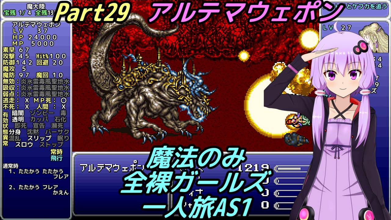 たとえ明日世界が滅亡しようとも今日私はリンゴの木を植える<br><br>・次回 … Part31 <a href="https://www.nicovideo.jp/watch/sm38878477" class="watch">sm38878477</a><br>・前回 … Part28 <a href="https://www.nicovideo.jp/watch/sm38532421" class="watch">sm38532421</a><br><br>・Youtube版 … <a href="https://youtu.be/oj8mh1LnvGU" target="_blank" rel="noopener nofollow">https://youtu.be/oj8mh1LnvGU</a><br>・字幕のみ … <a href="https://youtu.be/PFq_2xCxwYE" target="_blank" rel="noopener nofollow">https://youtu.be/PFq_2xCxwYE</a><br><br>【縛り内容】<br>1、魔法のみ<br>2、全裸(魔石はあり)<br>3、ガールズ<br>4、一人旅<br>5、アクティブ バトルスピード1 メッセージスピード1 詳細:<a href="https://www.nicovideo.jp/watch/sm34595412" class="watch">sm34595412</a><br>6、逃げられない!!表示の連射禁止<br>7、ボスの即死は禁止<br>8、宝物は全て集める<br>9、不具合やバグは不可<br>10、可能な限り低レベル<br>11、コマンド短縮やカーソル記憶しない<br>12、セーブ可能な場所でのみアイテム可<br>13、一部ストーリー上の編成でやむを得ない場合は最低限<br /><br>ふよふよしているの<br>絵:横沢さわらさん VOICEVOX:WhiteCUL<br><br>【シリーズ】<br>くうねるきゃんぷ … <a href="https://www.nicovideo.jp/series/516069" target="_blank" rel="noopener">series/516069</a><br>お写んぽ! … <a href="https://www.nicovideo.jp/series/435756" target="_blank" rel="noopener">series/435756</a><br>様子がおかしい! … <a href="https://www.nicovideo.jp/series/418875" target="_blank" rel="noopener">series/418875</a><br>FF7 魔法マテリアのみ初期防具ガールズ一人旅ASM … <a href="https://www.nicovideo.jp/series/438696" target="_blank" rel="noopener">series/438696</a><br>きんかつ!V-STROM1050XT … <a href="https://www.nicovideo.jp/series/144466" target="_blank" rel="noopener">series/144466</a><br>FF6 魔法のみ全裸ガールズ一人旅AS1 … <a href="https://www.nicovideo.jp/series/9438" target="_blank" rel="noopener">series/9438</a><br>おバイク!GLADIUS400 ABS … <a href="https://www.nicovideo.jp/series/68579" target="_blank" rel="noopener">series/68579</a><br>FF5 魔法のみ全裸一人旅AS1 … <a href="https://www.nicovideo.jp/series/9432" target="_blank" rel="noopener">series/9432</a><br>DQ3 呪文のみ全裸一人旅 … <a href="https://www.nicovideo.jp/series/9416" target="_blank" rel="noopener">series/9416</a><br>DQ2 ムーンブルクの王女一人旅 … <a href="https://www.nicovideo.jp/series/9414" target="_blank" rel="noopener">series/9414</a><br>DQ1 全裸 … <a href="https://www.nicovideo.jp/series/9412" target="_blank" rel="noopener">series/9412</a><br>FE 紋章の謎 天馬騎士単騎 第2部 英雄戦争 … <a href="https://www.nicovideo.jp/series/9404" target="_blank" rel="noopener">series/9404</a><br>FE 紋章の謎 天馬騎士単騎 第1部 暗黒戦争 … <a href="https://www.nicovideo.jp/series/9401" target="_blank" rel="noopener">series/9401</a><br>聖剣2 全裸プリム一人旅 武器Lv1など … <a href="https://www.nicovideo.jp/series/9396" target="_blank" rel="noopener">series/9396</a><br>ロマサガ2 魔術士不得意武器のみ … <a href="https://www.nicovideo.jp/series/9388" target="_blank" rel="noopener">series/9388</a><br>ロマサガ1 術法のみ一人旅で各イベント攻略 … <a href="https://www.nicovideo.jp/series/9386" target="_blank" rel="noopener">series/9386</a><br><br>SNSとか色々なリンク … <a href="https://lit.link/Unaa" target="_blank" rel="noopener nofollow">https://lit.link/Unaa</a>